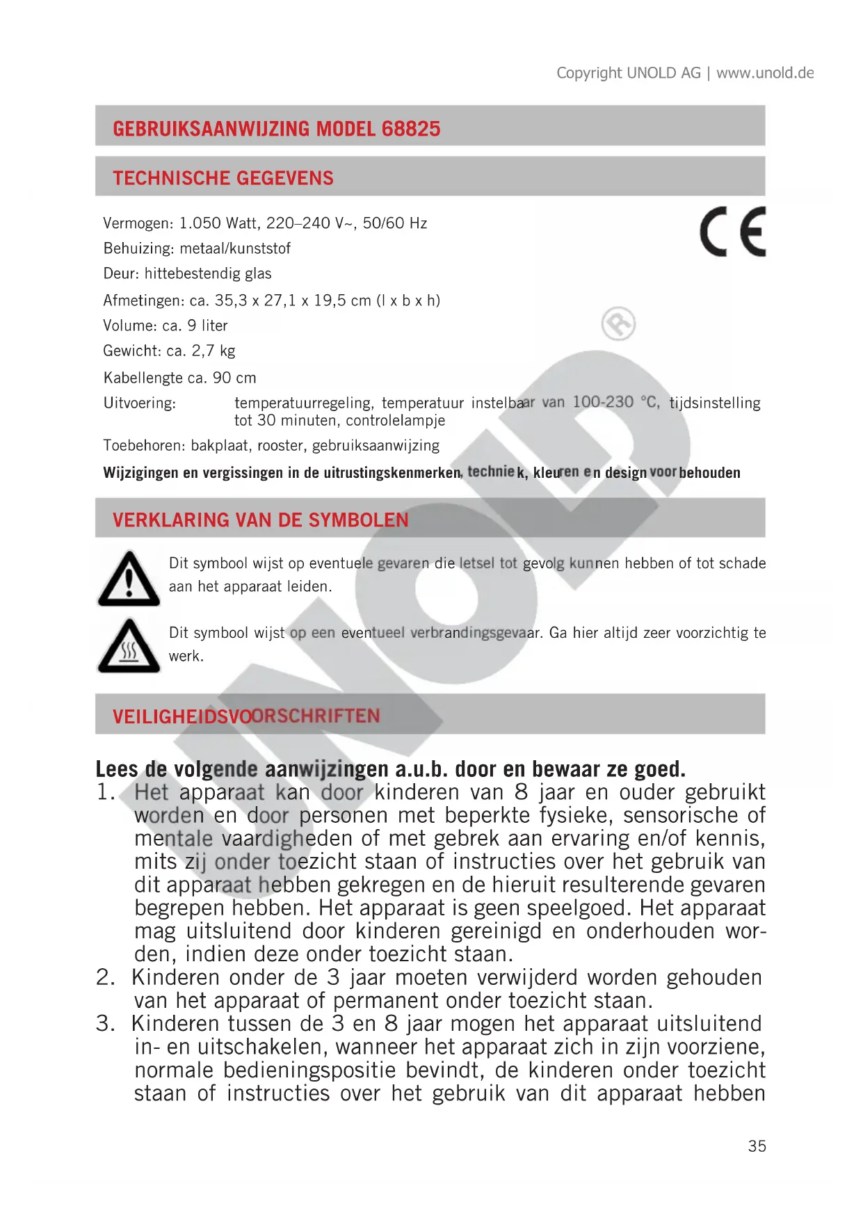 Dit symbool wijst op eventuele gevaren die letsel tot gevolg kunnen hebben of tot schade aan het apparaat leiden. Dit symbool wijst op een eventueel verbrandingsgevaar. Ga hier altijd zeer voorzichtig te werk. Copyright UNOLD AG | www.unold.de36 gekregen en de hieruit resulterende gevaren begrepen hebben. Kinderen tussen de 3 en 8 jaar mogen het apparaat niet aanslui- ten, bedienen, reinigen of onderhouden.