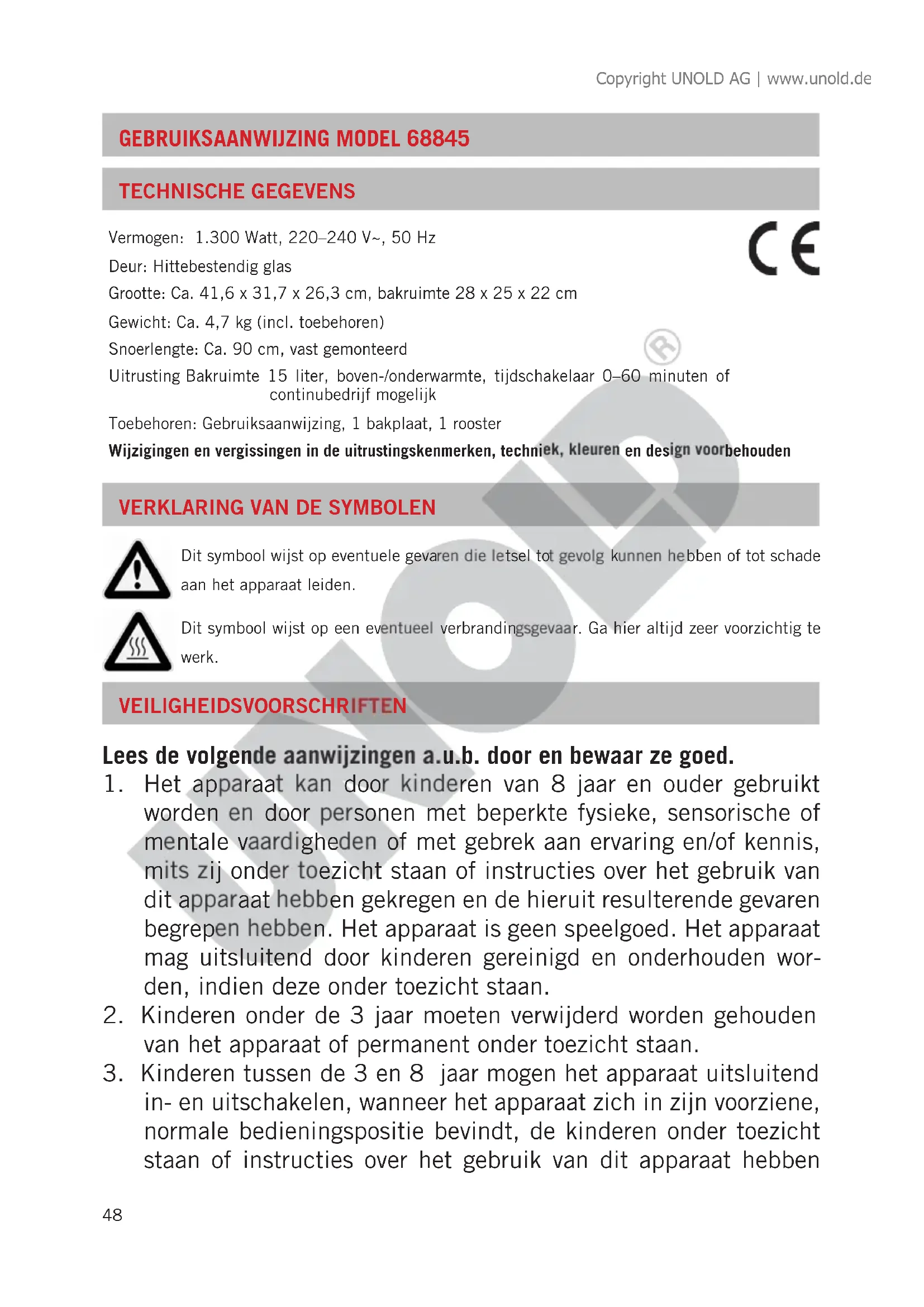 Dit symbool wijst op eventuele gevaren die letsel tot gevolg kunnen hebben of tot schade aan het apparaat leiden. Dit symbool wijst op een eventueel verbrandingsgevaar. Ga hier altijd zeer voorzichtig te werk. Copyright UNOLD AG | www.unold.de49 gekregen en de hieruit resulterende gevaren begrepen hebben. Kinderen tussen de 3 en 8 jaar mogen het apparaat niet aanslui- ten, bedienen, reinigen of onderhouden.