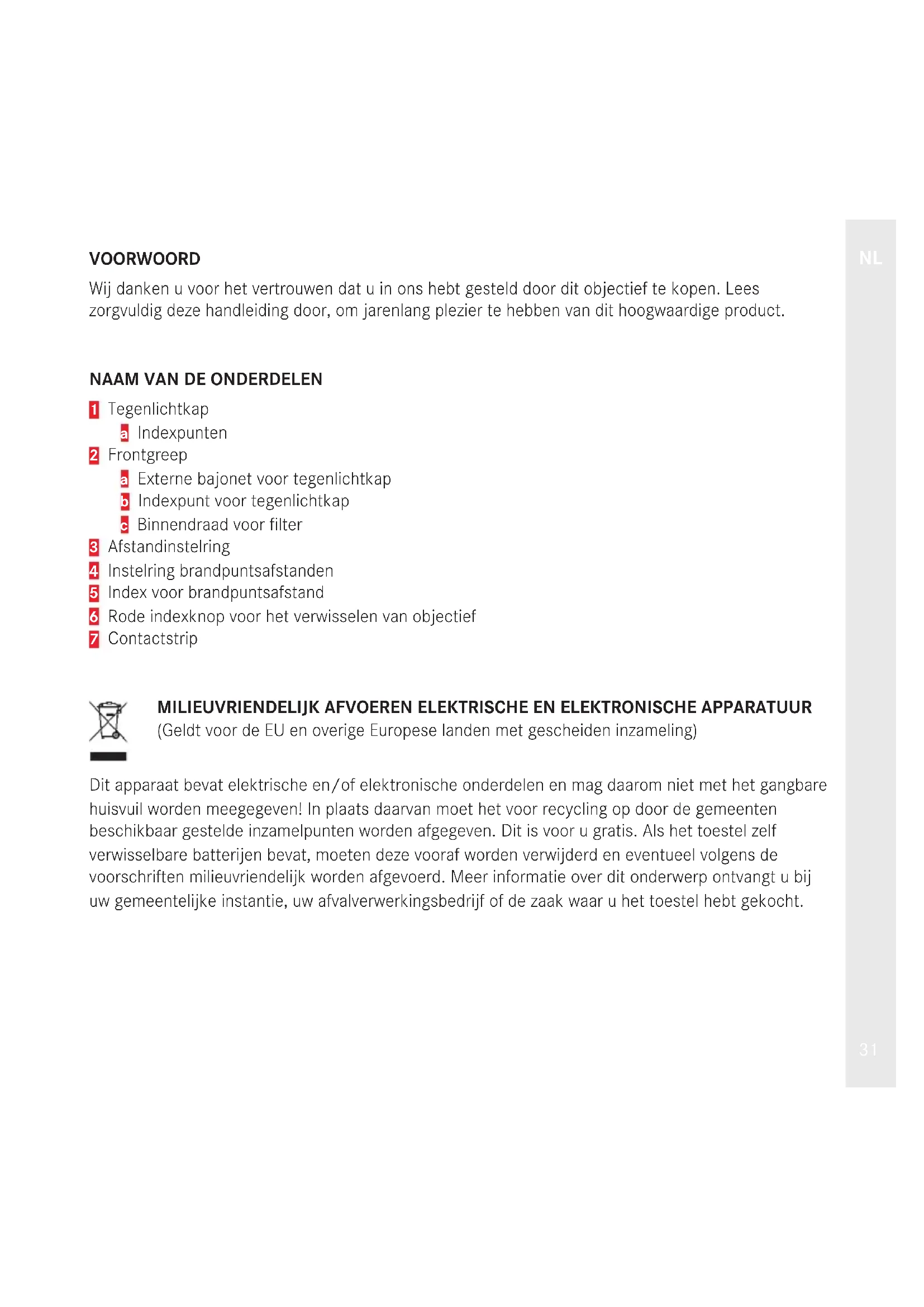 VOORWOORD Wij danken u voor het vertrouwen dat u in ons hebt gesteld door dit objectief te kopen. Lees zorgvuldig deze handleiding door, om jarenlang plezier te hebben van dit hoogwaardige product.