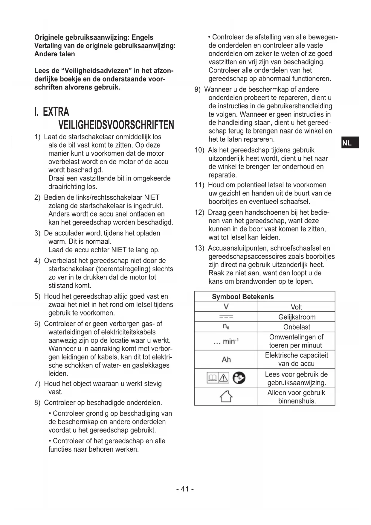 gereedschapsaccessoires zoals boorbitjes zijn direct na gebruik uitzonderlijk heet. Raak ze niet aan, want dan loopt u de kans om brandwonden op te lopen. Symbool Betekenis Volt Gelijkstroom Onbelast Omwentelingen of toeren per minuut Elektrische capaciteit van de accu Lees voor gebruik de gebruiksaanwijzing. Alleen voor gebruik binnenshuis.- 42 -