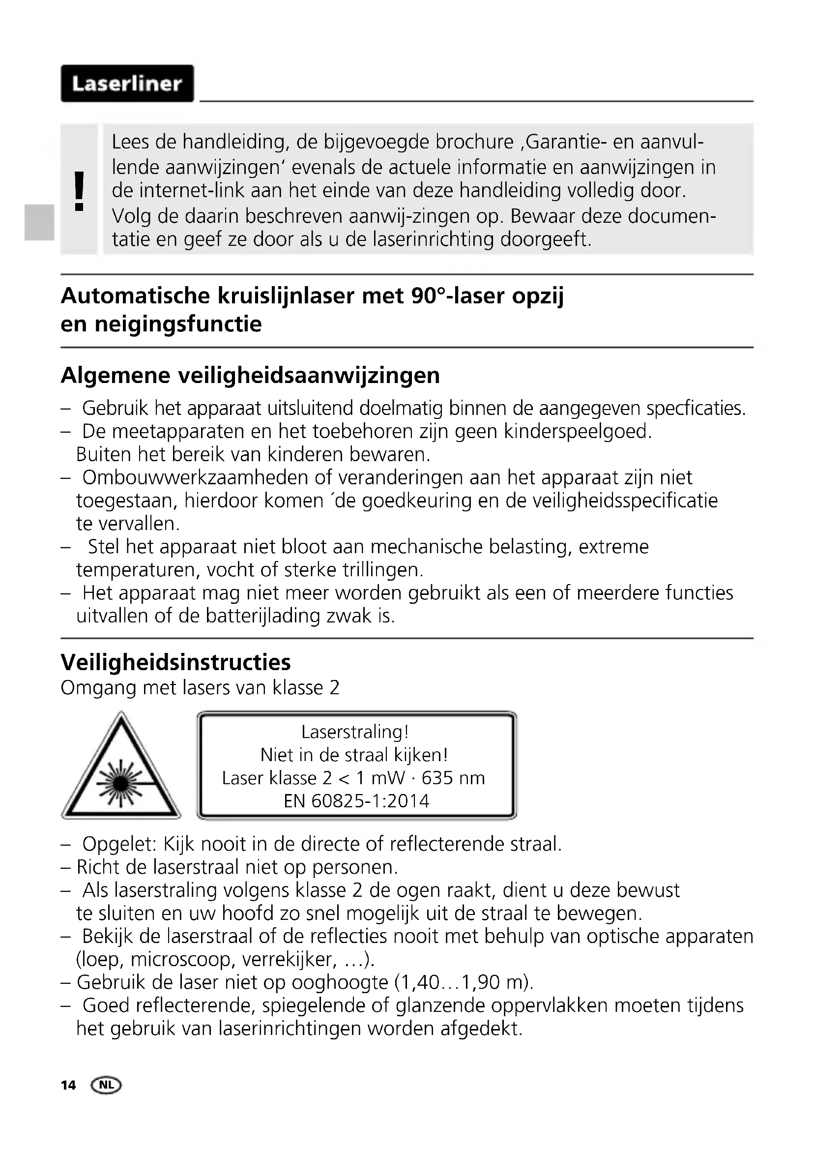 – Opgelet: Kijk nooit in de directe of reecterende straal. – Richt de laserstraal niet op personen. – Als laserstraling volgens klasse 2 de ogen raakt, dient u deze bewust te sluiten en uw hoofd zo snel mogelijk uit de straal te bewegen. – Bekijk de laserstraal of de reecties nooit met behulp van optische apparaten (loep, microscoop, verrekijker, …). – Gebruik de laser niet op ooghoogte (1,40…1,90 m). – Goed reecterende, spiegelende of glanzende oppervlakken moeten tijdens het gebruik van laserinrichtingen worden afgedekt. Veiligheidsinstructies Omgang met lasers van klasse 2 – Gebruik het apparaat uitsluitend doelmatig binnen de aangegeven speccaties. – De meetapparaten en het toebehoren zijn geen kinderspeelgoed. Buiten het bereik van kinderen bewaren. – Ombouwwerkzaamheden of veranderingen aan het apparaat zijn niet toegestaan, hierdoor komen ´de goedkeuring en de veiligheidsspecicatie te vervallen. – Stel het apparaat niet bloot aan mechanische belasting, extreme temperaturen, vocht of sterke trillingen. – Het apparaat mag niet meer worden gebruikt als een of meerdere functies uitvallen of de batterijlading zwak is. Algemene veiligheidsaanwijzingen Laserstraling! Niet in de straal kijken! Laser klasse 2 < 1 mW · 635 nm EN 60825-1:2014 Automatische kruislijnlaser met 90°-laser opzij en neigingsfunctie NL15 CompactCube-Laser 3