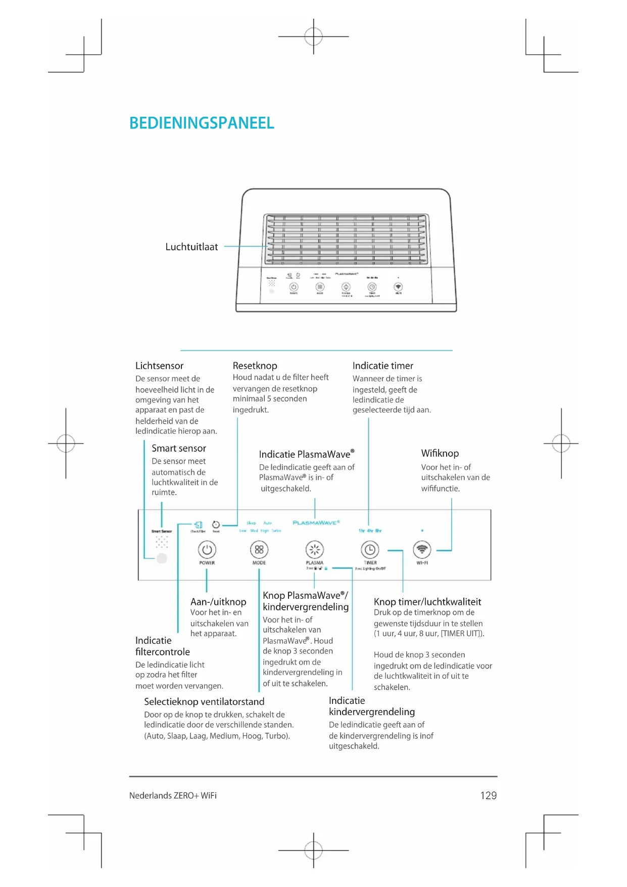 ZERO+ WiFi (AZPU373-HWE) User Manual Model Use & Care Guide Please read and follow all safety rules and instructionsin this manual before operating.The product warranty is printed on the back of thisguide, so please keep it in a safe place for future use.129 Nederlands ZERO+ WiFi BEDIENINGSPANEEL Luchtuitlaat Lichtsensor De sensor meet de hoeveelheid licht in de omgeving van het apparaat en past de helderheid van de ledindicatie hierop aan. Selectieknop ventilatorstand Door op de knop te drukken, schakelt de ledindicatie door de verschillende standen. (Auto, Slaap, Laag, Medium, Hoog, Turbo). Indicatie kindervergrendeling De ledindicatie geeft aan of de kindervergrendeling is inof uitgeschakeld. Indicatie timer Wanneer de timer is ingesteld, geeft de ledindicatie de geselecteerde tijd aan. Indicatie PlasmaWave De ledindicatie geeft aan of PlasmaWave is in- of uitgeschakeld. Knop timer/luchtkwaliteit Druk op de timerknop om de gewenste tijdsduur in te stellen (1 uur, 4 uur, 8 uur, [TIMER UIT]). Houd de knop 3 seconden ingedrukt om de ledindicatie voor de luchtkwaliteit in of uit te schakelen. Smart sensor De sensor meet automatisch de luchtkwaliteit in de ruimte. Wiknop Voor het in- of uitschakelen van de wifunctie. Resetknop Houd nadat u de lter heeft vervangen de resetknop minimaal 5 seconden ingedrukt. Aan-/uitknop Voor het in- en uitschakelen van het apparaat. Indicatie ltercontrole De ledindicatie licht op zodra het lter moet worden vervangen. Knop PlasmaWave / kindervergrendeling Voor het in- of uitschakelen van PlasmaWave . Houd de knop 3 seconden ingedrukt om de kindervergrendeling in of uit te schakelen.130 Nederlands ZERO+ WiFi