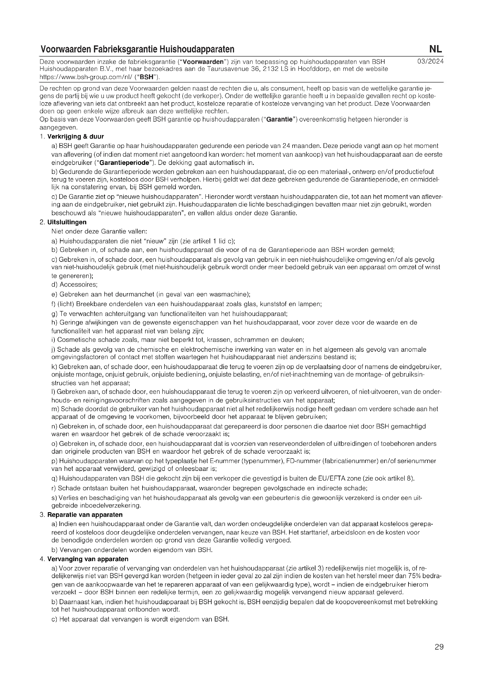 Deze voorwaarden inzake de fabrieksgarantie (“Voorwaarden”) zijn van toepassing op huishoudapparaten van BSH Huishoudapparaten B.V., met haar bezoekadres aan de Taurusavenue 36, 2132 LS in Hoofddorp, en met de website https://www.bsh-group.com/nl/ (“BSH”). 03/2024 De rechten op grond van deze Voorwaarden gelden naast de rechten die u, als consument, heeft op basis van de wettelijke garantie je- gens de partij bij wie u uw product heeft gekocht (de verkoper). Onder de wettelijke garantie heeft u in bepaalde gevallen recht op koste- loze aflevering van iets dat ontbreekt aan het product, kosteloze reparatie of kosteloze vervanging van het product. Deze Voorwaarden doen op geen enkele wijze afbreuk aan deze wettelijke rechten. Op basis van deze Voorwaarden geeft BSH garantie op huishoudapparaten (“Garantie”) overeenkomstig hetgeen hieronder is aangegeven.