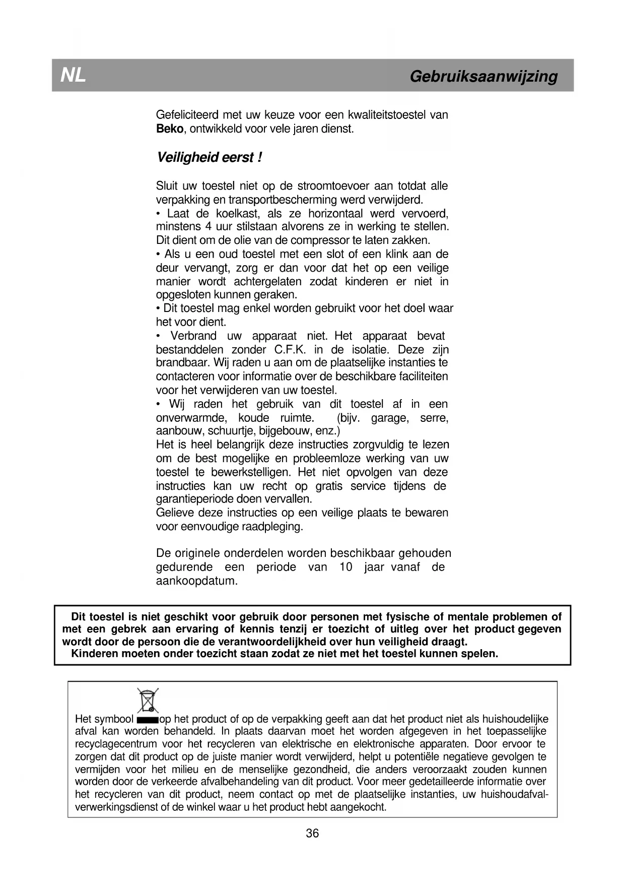 Veiligheid eerst / Elektriciteitsvereisten ; Transportinstructies /37 Installatie -instructies; Uw toestel leren kennen /37 Voorstel voor de schikking van de etenswaren in het toestel / Temperatuurmeting en -regeling /38 Alvorens de inwerkstelling / Diepvriesproducten bewaren / Verse etenswaren invriezen / IJsblokjes maken ; Ontdooien /39 Het binnenlichtje vervangen ; Schoonmaak en onderhoud /39 De deur verplaatsen ; Wel en niet doen /40 Energieverbruik ; Informatie over de functiegeluiden /41 Problemen oplossen /