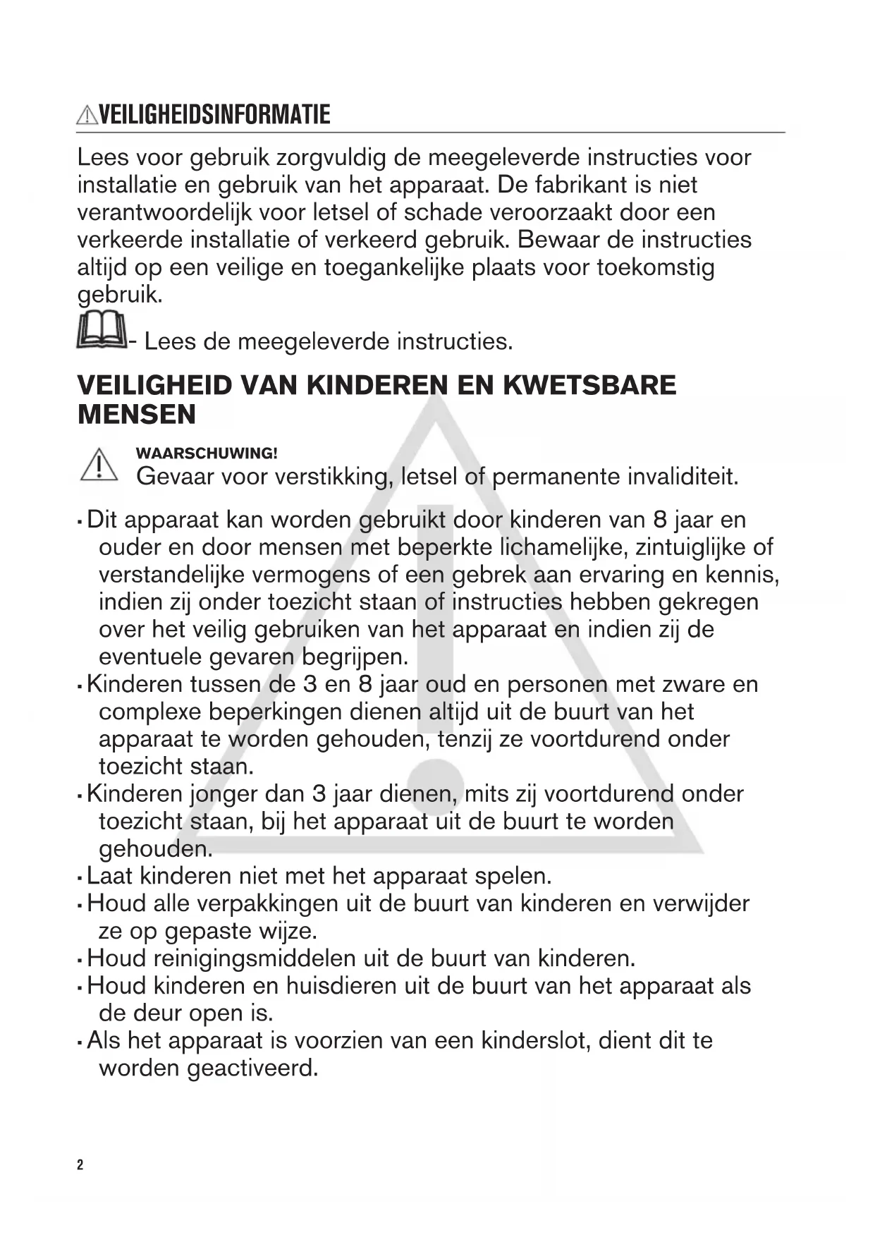 - Als het apparaat is voorzien van een kinderslot, dient dit te worden geactiveerd. 2• Kinderen mogen zonder toezicht geen reinigings- en onderhoudswerkzaamheden aan het apparaat uitvoeren. ALGEMENE VEILIGHEID