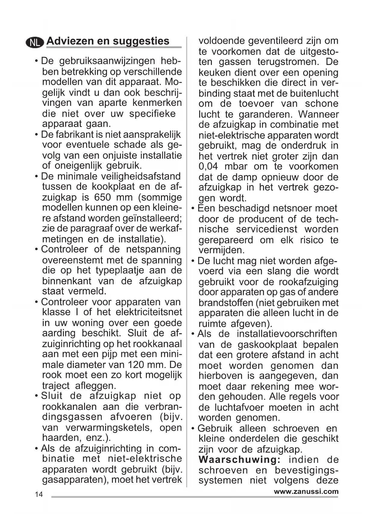 - Gebruik alleen schroeven en kleine onderdelen die geschikt zijn voor de afzuigkap. Waarschuwing: indien de schroeven en bevestigings- systemen niet volgens deze NL15 www.zanussi.com aanwijzingen worden geïnstal- leerd, bestaat het gevaar voor elektrische schokken.