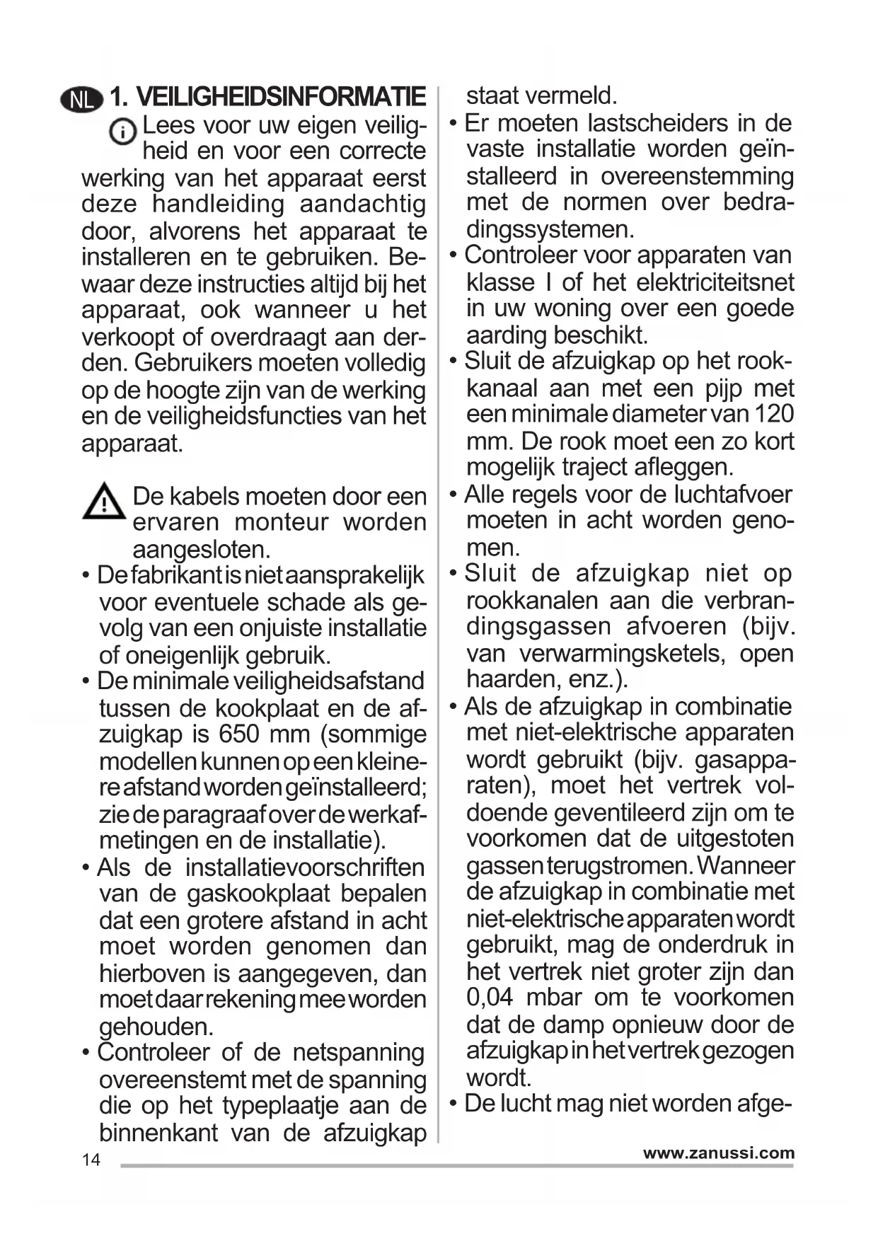 - De lucht mag niet worden afge- NL15 www.zanussi.com voerd door een kanaal dat wordt gebruikt voor de rookgasafvoer door apparaten op gas of andere brandstoffen.
