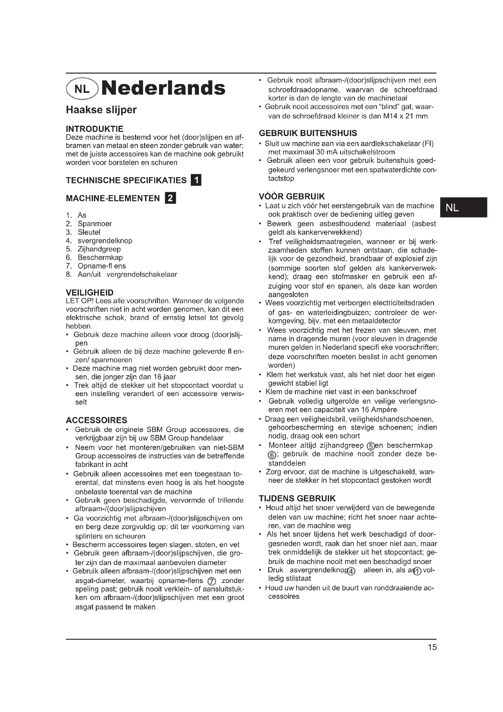 - Gebruik de originele SBM Group accessoires, die verkrijgbaar zijn bij uw SBM Group handelaar• Neem voor het monteren/gebruiken van niet-SBM Group accessoires de instructies van de betreffende fabrikant in acht• Gebruik alleen accessoires met een toegestaan to-erental, dat minstens even hoog is als het hoogste onbelaste toerental van de machine• Gebruik geen beschadigde, vervormde of trillende afbraam-/(door)slijpschijven• Ga voorzichtig met afbraam-/(door)slijpschijven om en berg deze zorgvuldig op; dit ter voorkoming van splinters en scheuren• Bescherm accessoires tegen slagen, stoten, en vet• Gebruik geen afbraam-/(door)slijpschijven, die gro-ter zijn dan de maximaal aanbevolen diameter• Gebruik alleen afbraam-/(door)slijpschijven met een asgat-diameter, waarbij opname-fl ens zonder speling past; gebruik nooit verklein- of aansluitstuk-ken om afbraam-/(door)slijpschijven met een groot asgat passend te maken• Gebruik nooit afbraam-/(door)slijpschijven met een schroefdraadopname, waarvan de schroefdraad korter is dan de lengte van de machinetaal• Gebruik nooit accessoires met een “blind” gat, waar-van de schroefdraad kleiner is dan M14 x 21 mm GEBRUIK BUITENSHUIS