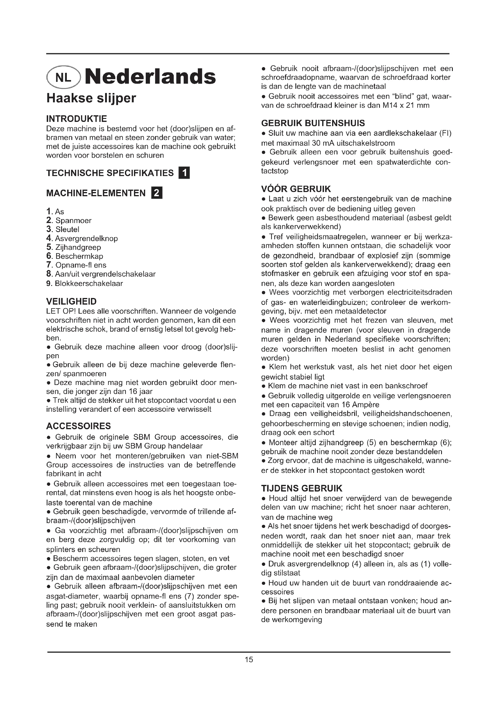 VEILIGHEID LET OP! Lees alle voorschriften. Wanneer de volgende voorschriften niet in acht worden genomen, kan dit een elektrische schok, brand of ernstig letsel tot gevolg heb- ben. ● Gebruik deze machine alleen voor droog (door)slij- pen ● Gebruik alleen de bij deze machine geleverde fl en- zen/ spanmoeren● Deze machine mag niet worden gebruikt door men-sen, die jonger zijn dan 16 jaar● Trek altijd de stekker uit het stopcontact voordat u een instelling verandert of een accessoire verwisselt ACCESSOIRES ● Gebruik de originele SBM Group accessoires, die verkrijgbaar zijn bij uw SBM Group handelaar● Neem voor het monteren/gebruiken van niet-SBM Group accessoires de instructies van de betreffende fabrikant in acht● Gebruik alleen accessoires met een toegestaan toe-rental, dat minstens even hoog is als het hoogste onbe-laste toerental van de machine● Gebruik geen beschadigde, vervormde of trillende af-braam-/(door)slijpschijven● Ga voorzichtig met afbraam-/(door)slijpschijven om en berg deze zorgvuldig op; dit ter voorkoming van splinters en scheuren● Bescherm accessoires tegen slagen, stoten, en vet● Gebruik geen afbraam-/(door)slijpschijven, die groter zijn dan de maximaal aanbevolen diameter● Gebruik alleen afbraam-/(door)slijpschijven met een asgat-diameter, waarbij opname-fl ens (7) zonder spe-ling past; gebruik nooit verklein- of aansluitstukken om afbraam-/(door)slijpschijven met een groot asgat pas-send te maken● Gebruik nooit afbraam-/(door)slijpschijven met een schroefdraadopname, waarvan de schroefdraad korter is dan de lengte van de machinetaal● Gebruik nooit accessoires met een “blind” gat, waar-van de schroefdraad kleiner is dan M14 x 21 mm GEBRUIK BUITENSHUIS ● Sluit uw machine aan via een aardlekschakelaar (FI) met maximaal 30 mA uitschakelstroom● Gebruik alleen een voor gebruik buitenshuis goed-gekeurd verlengsnoer met een spatwaterdichte con-tactstop
