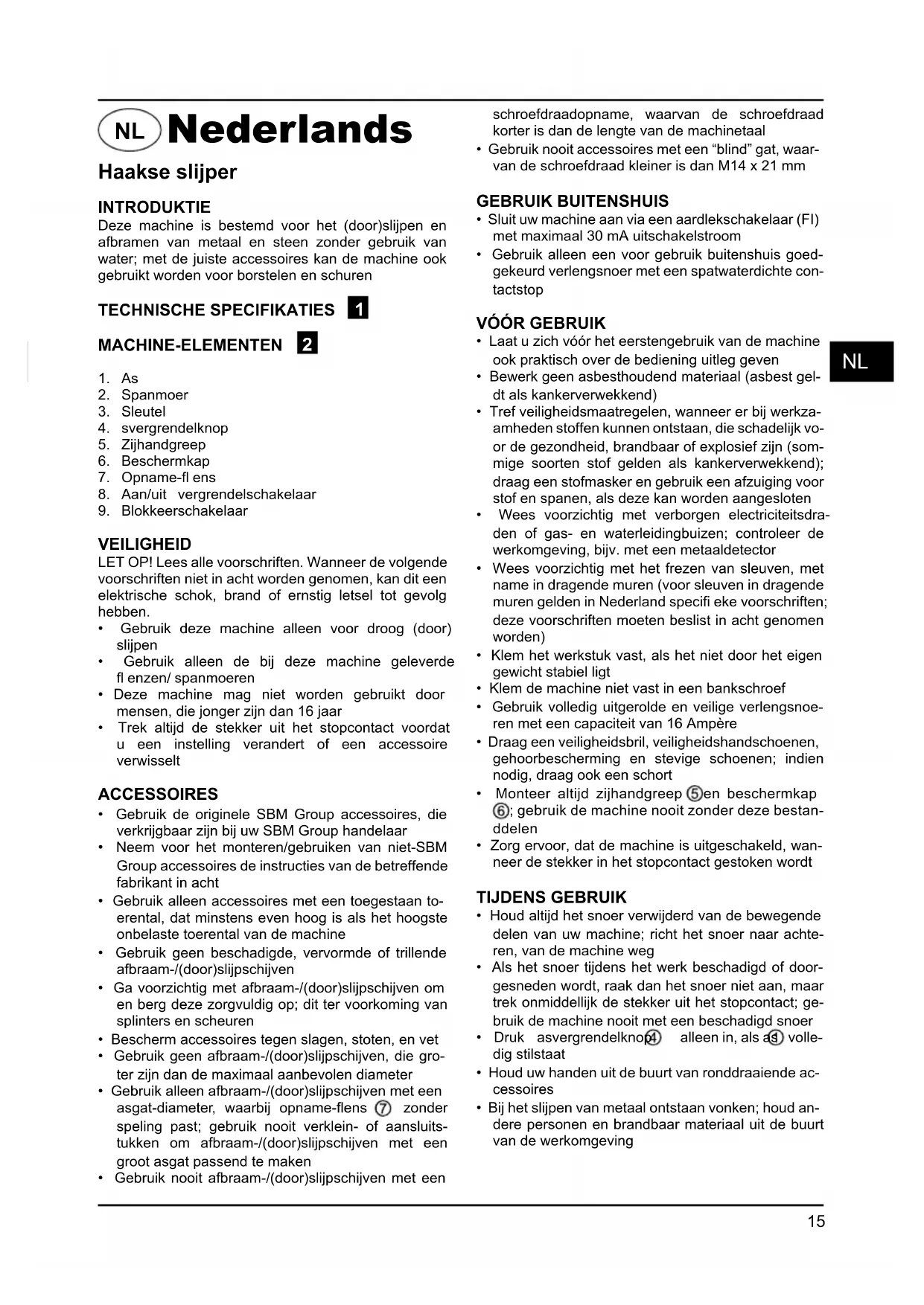 - Gebruik de originele SBM Group accessoires, die verkrijgbaar zijn bij uw SBM Group handelaar• Neem voor het monteren/gebruiken van niet-SBM Group accessoires de instructies van de betreffende fabrikant in acht• Gebruik alleen accessoires met een toegestaan to-erental, dat minstens even hoog is als het hoogste onbelaste toerental van de machine• Gebruik geen beschadigde, vervormde of trillende afbraam-/(door)slijpschijven• Ga voorzichtig met afbraam-/(door)slijpschijven om en berg deze zorgvuldig op; dit ter voorkoming van splinters en scheuren• Bescherm accessoires tegen slagen, stoten, en vet• Gebruik geen afbraam-/(door)slijpschijven, die gro-ter zijn dan de maximaal aanbevolen diameter• Gebruik alleen afbraam-/(door)slijpschijven met een asgat-diameter, waarbij opname-fl ens zonder speling past; gebruik nooit verklein- of aansluits-tukken om afbraam-/(door)slijpschijven met een groot asgat passend te maken• Gebruik nooit afbraam-/(door)slijpschijven met een schroefdraadopname, waarvan de schroefdraad korter is dan de lengte van de machinetaal• Gebruik nooit accessoires met een “blind” gat, waar-van de schroefdraad kleiner is dan M14 x 21 mm GEBRUIK BUITENSHUIS