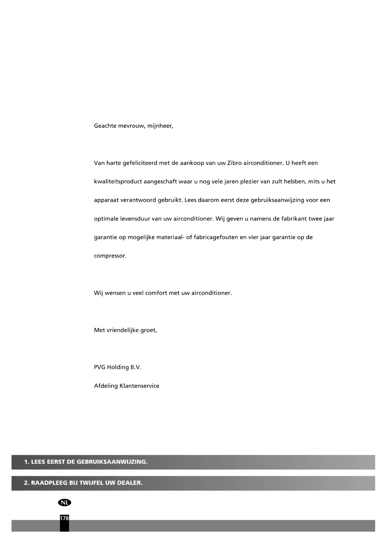 Geachte mevrouw, mijnheer, Van harte gefeliciteerd met de aankoop van uw Zibro airconditioner. U heeft een kwaliteitsproduct aangeschaft waar u nog vele jaren plezier van zult hebben, mits u het apparaat verantwoord gebruikt. Lees daarom eerst deze gebruiksaanwijzing voor een optimale levensduur van uw airconditioner. Wij geven u namens de fabrikant twee jaar garantie op mogelijke materiaal- of fabricagefouten en vier jaar garantie op de compressor. Wij wensen u veel comfort met uw airconditioner. Met vriendelijke groet, PVG Holding B.V. Afdeling Klantenservice man_S(C)32xx.qxd:man_S18xx 12-02-13 09:58 Page 1781