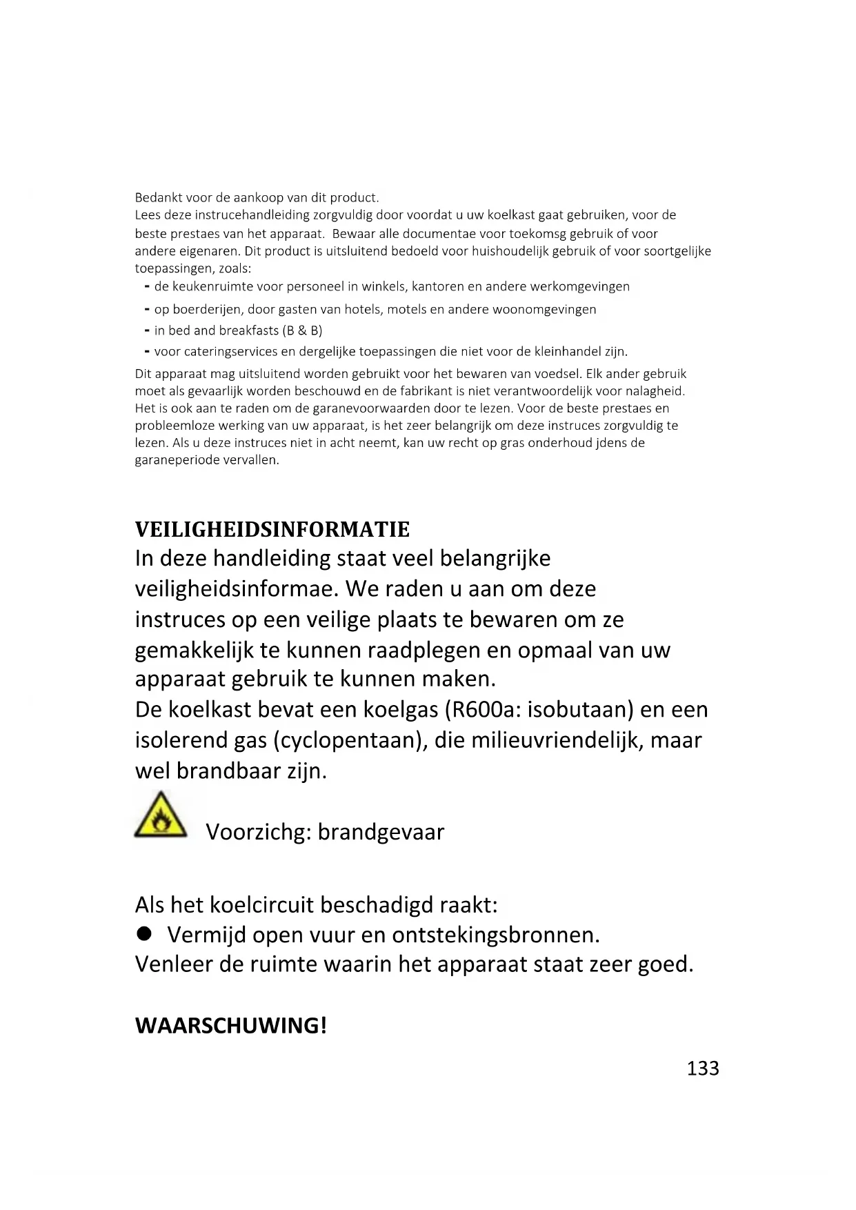 Bedankt voor de aankoop van dit product. Lees deze instructiehandleiding zorgvuldig door voordat u uw koelkast gaat gebruiken, voor de beste prestaties van het apparaat. Bewaar alle documentatie voor toekomstig gebruik of voor andere eigenaren. Dit product is uitsluitend bedoeld voor huishoudelijk gebruik of voor soortgelijke toepassingen, zoals: - de keukenruimte voor personeel in winkels, kantoren en andere werkomgevingen - op boerderijen, door gasten van hotels, motels en andere woonomgevingen - in bed and breakfasts (B & B) - voor cateringservices en dergelijke toepassingen die niet voor de kleinhandel zijn. Dit apparaat mag uitsluitend worden gebruikt voor het bewaren van voedsel. Elk ander gebruik moet als gevaarlijk worden beschouwd en de fabrikant is niet verantwoordelijk voor nalatigheid. Het is ook aan te raden om de garantievoorwaarden door te lezen. Voor de beste prestaties en probleemloze werking van uw apparaat, is het zeer belangrijk om deze instructies zorgvuldig te lezen. Als u deze instructies niet in acht neemt, kan uw recht op gratis onderhoud tijdens de garantieperiode vervallen. VEILIGHEIDSINFORMATIE In deze handleiding staat veel belangrijke veiligheidsinformatie. We raden u aan om deze instructies op een veilige plaats te bewaren om ze gemakkelijk te kunnen raadplegen en optimaal van uw apparaat gebruik te kunnen maken. De koelkast bevat een koelgas (R600a: isobutaan) en een isolerend gas (cyclopentaan), die milieuvriendelijk, maar wel brandbaar zijn. Voorzichtig: brandgevaar Als het koelcircuit beschadigd raakt: Vermijd open vuur en ontstekingsbronnen. Ventileer de ruimte waarin het apparaat staat zeer goed. Percentage bedrijfstijd: WAARSCHUWING!134 Wees bij het reinigen/verplaatsen van het apparaat voorzichtig om de metalen condensatordraden aan de achterkant van het apparaat niet aan te raken, omdat u daardoor uw vingers en handen kunt verwonden of uw product kunt beschadigen. Dit apparaat is niet ontworpen om op andere apparaten te stapelen. Probeer niet op uw apparaat te zitten of te staan, omdat het daar niet voor is ontworpen. U kunt uzelf verwonden of het apparaat beschadigen. Zorg ervoor dat het netsnoer niet beklemd zit onder het apparaat tijdens en na het vervoeren/verplaatsen van het apparaat, om te voorkomen dat het netsnoer doorgesneden of beschadigd raakt. Let bij het plaatsen van uw apparaat goed op om uw vloer, leidingen, wandbekleding enz. niet te beschadigen. Verplaats het apparaat niet door het aan het deksel of de handgreep te trekken. Laat kinderen niet met het apparaat spelen of aan de bedieningselementen komen. Ons bedrijf wijst alle aansprakelijkheid van de hand als de instructies niet worden gevolgd. Installeer het apparaat niet in vochtige, olieachtige of stoffige plaatsen en stel het niet bloot aan direct zonlicht of water. Installeer het apparaat niet in de buurt van135 verwarmingsapparaten of ontvlambare materialen. Open het deksel niet als er een stroomstoring is. Als de storing korter dan 20 uur duurt, zou deze geen effect moeten hebben op bevroren voedsel. Als de storing langer duurt, moet het voedsel worden gecontroleerd en onmiddellijk worden geconsumeerd of bereid en daarna opnieuw ingevroren. Maakt u zich geen zorgen als het deksel van de diepvrieskist moeilijk te openen is meteen nadat u het heeft gesloten. Dit komt door het drukverschil, dat gewoonlijk na enkele minuten verdwijnt waardoor het deksel gewoon kan worden geopend. Sluit het apparaat niet aan op de elektriciteitsvoorziening voordat alle verpakkingen en transportbeschermers zijn verwijderd. Laat het apparaat minstens 4 uur staan voordat u het aanzet, om de compressorolie te laten stabiliseren na horizontaal transport. Deze vriezer mag alleen worden gebruikt voor het beoogde doel (d.w.z. het bewaren en invriezen van eetbare voedingsmiddelen). Bewaar geen medicijnen of onderzoeksmaterialen in de wijnkoelers. Als er materiaal moet worden opgeslagen waarvoor een strenge controle van de opslagtemperatuur vereist is, kan dit bederven of136 kan er een ongecontroleerde reactie optreden die risico's kan veroorzaken. Haal de stekker uit het stopcontact voordat u handelingen uitvoert. Controleer bij levering of het product niet beschadigd is en of alle onderdelen en accessoires in perfecte staat zijn. Als in het koelsysteem een lek opgemerkt wordt, raak dan de wandcontactdoos niet aan en gebruik geen open vlammen. Open het venster en laat lucht de kamer binnenkomen. Bel vervolgens een servicecentrum en vraag om reparatie. Gebruik geen verlengsnoeren of adapters. Trek niet te hard aan het netsnoer, vouw het niet dubbel en raak de stekker niet met natte handen aan. Beschadig de stekker en/of het netsnoer niet; dit kan elektrische schokken of brand veroorzaken. Plaats geen brandbare en sterk vluchtige materialen zoals ether, benzine, LPG, propaangas, spuitbussen, lijm, pure alcohol, enz. op of in het apparaat. Deze materialen kunnen een explosie veroorzaken. Als het netsnoer van het apparaat is beschadigd, moet het worden vervangen door de fabrikant, diens technische dienst of personen met vergelijkbare kwalificaties, om gevaarlijke situaties te voorkomen.137 Gebruik of bewaar geen ontvlambare sprays, zoals verfbussen in de buurt van de wijnkoelers. Deze kunnen een explosie of brand veroorzaken. Plaats geen voorwerpen en/of houders gevuld met water bovenop het apparaat. We raden het gebruik van verlengsnoeren en multi-adapters niet aan. Verbrand het apparaat niet als u het weg wilt doen. Wees voorzichtig dat u het koelcircuit/de koelleidingen van het apparaat niet beschadigt tijdens het transport en het gebruik. Stel in het geval van schade het apparaat niet bloot aan brand, mogelijke ontstekingsbronnen en ventileer onmiddellijk de ruimte waarin het apparaat staat. Het koelsysteem dat zich achter en binnenin de wijnkoelers bevindt, bevat een koelmiddel. Zorg er daarom voor dat de buizen niet beschadigd raken. Gebruik geen elektrische apparaten in de bewaarruimten voor levensmidde