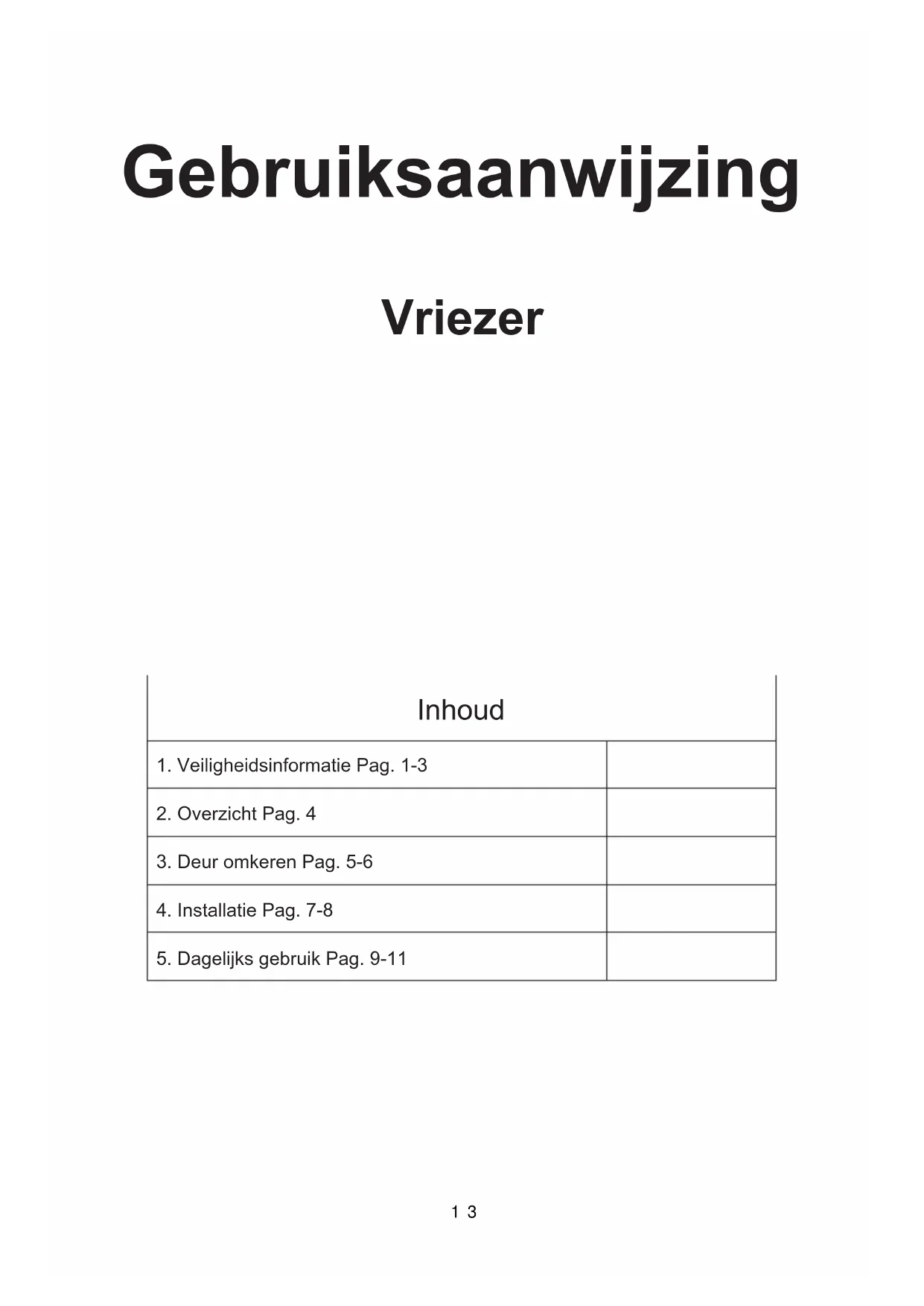 - Het invriezen duurt 24 uur: leg tijdens deze periode geen ander voedsel in de vriezer. Bewaren van ingevroren voedsel Bij de eerste opstart of na een periode waarin de vriezer niet gebruikt is. Voordat u voedsel in de vriezer legt, dient u het apparaat minimaal 2 uur te laten werken op een hogere stand. Belangrijk! Bij onbedoeld ontdooien, bijvoorbeeld na een stroomuitval die langer duurt dan de weergegeven waarde in de tabel met technische kenmerken onder “oplooptijd”, moet het ontdooide voedsel snel worden geconsumeerd of onmiddellijk worden gekookt en dan opnieuw ingevroren (nadat het gekookt is). Ontdooien Diepgevroren of ingevroren voedsel kan voordat het wordt gebruikt, worden ontdooid in de vriezer of bij kamertemperatuur, afhankelijk van de tijd die hiervoor beschikbaar is. Kleine stukken kunnen ook bevroren worden bereid, rechtstreeks uit de vriezer. In dat geval duurt de bereiding wel langer. IJsblokjes Dit apparaat kan voorzien zijn van één of meer bakjes voor het maken van ijsblokjes. Handige tips Tips voor invriezen Hier volgen enkele belangrijke tips voor het invriezen: