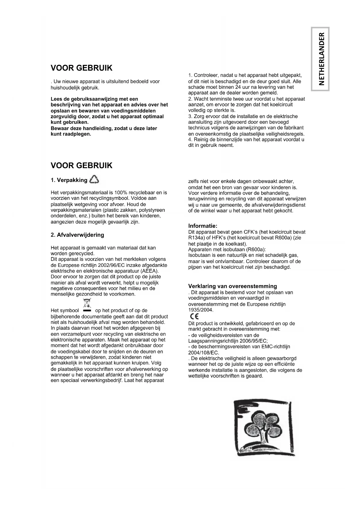 Verklaring van overeenstemming . Dit apparaat is bestemd voor het opslaan van voedingsmiddelen en vervaardigd in overeenstemming met de Europese richtlijn 1935/2004. Dit product is ontwikkeld, gefabriceerd en op de markt gebracht in overeenstemming met: - de veiligheidsvereisten van de Laagspanningsrichtlijn 2006/95/EC; - de beschermingsvereisten van EMC-richtlijn 2004/108/EC. . De elektrische veiligheid is alleen gewaarborgd wanneer het op de juiste wijze op een efficiënte werkende installatie is aangesloten, die volgens de wettelijke voorschriften is geaard.
