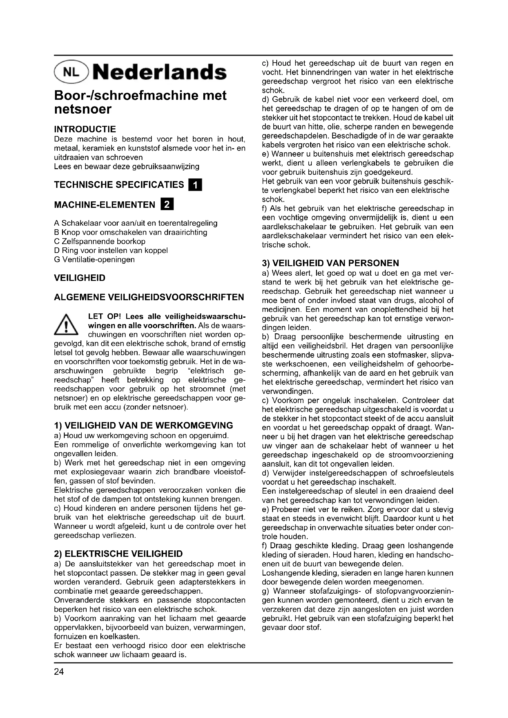 - Quando avvitate una vite su legno duro, è preferibile forare un foro precedentemente Il vostro apparecchio è doppiamente isolato in conformità all’ EN60745; pertanto non è ne- cessario alcun cavo di collegamento a terra.24 Boor-/schroefmachine met netsnoer INTRODUCTIE Deze machine is bestemd voor het boren in hout, metaal, keramiek en kunststof alsmede voor het in- en uitdraaien van schroeven Lees en bewaar deze gebruiksaanwijzing TECHNISCHE SPECIFICATIES