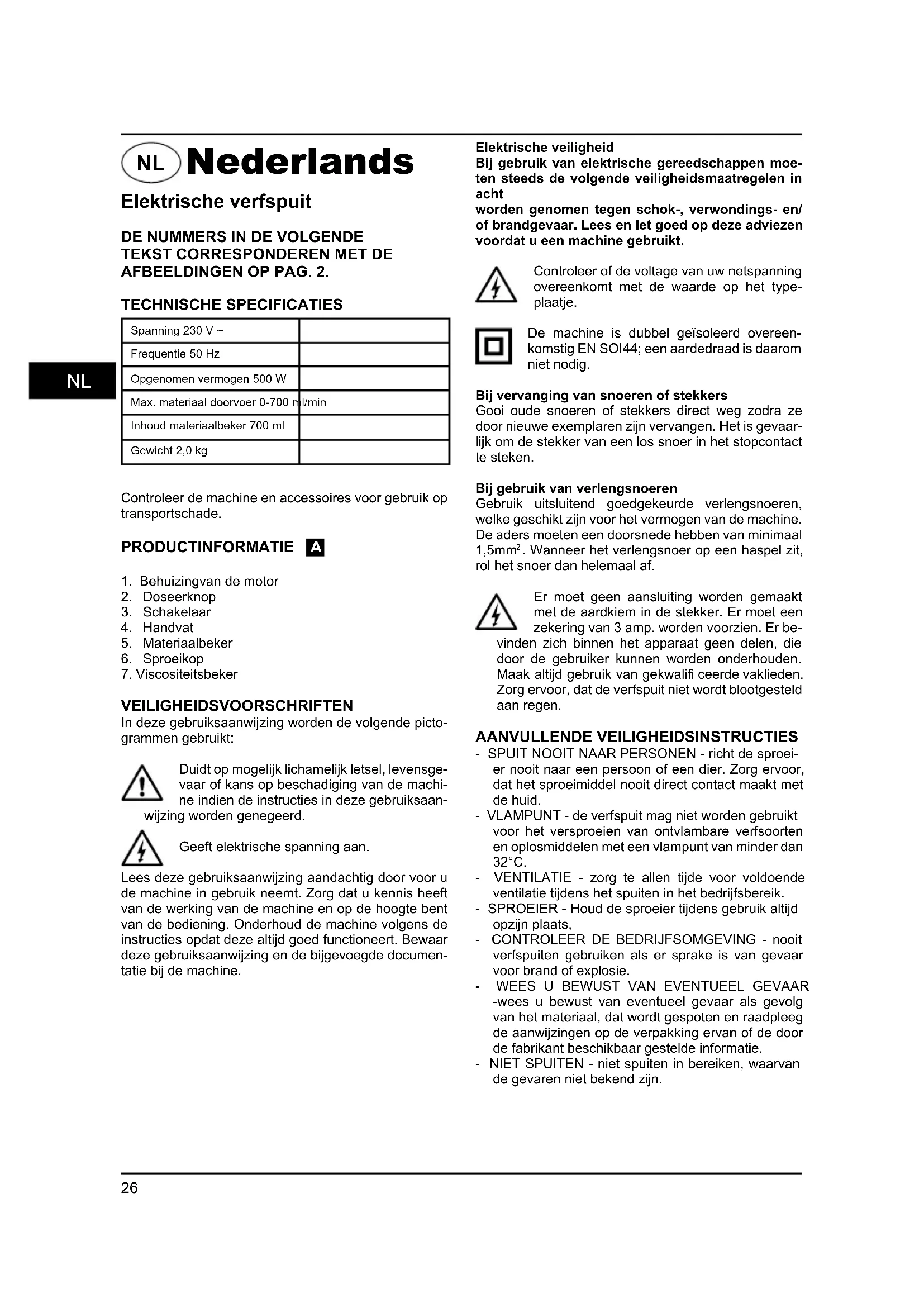 . Wanneer het verlengsnoer op een haspel zit, rol het snoer dan helemaal af. Er moet geen aansluiting worden gemaakt met de aardkiem in de stekker. Er moet een zekering van 3 amp. worden voorzien. Er be- vinden zich binnen het apparaat geen delen, die door de gebruiker kunnen worden onderhouden. Maak altijd gebruik van gekwalifi ceerde vaklieden. Zorg ervoor, dat de verfspuit niet wordt blootgesteld aan regen. AANVULLENDE VEILIGHEIDSINSTRUCTIES - SPUIT NOOIT NAAR PERSONEN - richt de sproei- er nooit naar een persoon of een dier. Zorg ervoor, dat het sproeimiddel nooit direct contact maakt met de huid. - VLAMPUNT - de verfspuit mag niet worden gebruikt voor het versproeien van ontvlambare verfsoorten en oplosmiddelen met een vlampunt van minder dan 32°C. - VENTILATIE - zorg te allen tijde voor voldoende ventilatie tijdens het spuiten in het bedrijfsbereik. - SPROEIER - Houd de sproeier tijdens gebruik altijd opzijn plaats, - CONTROLEER DE BEDRIJFSOMGEVING - nooit verfspuiten gebruiken als er sprake is van gevaar voor brand of explosie.