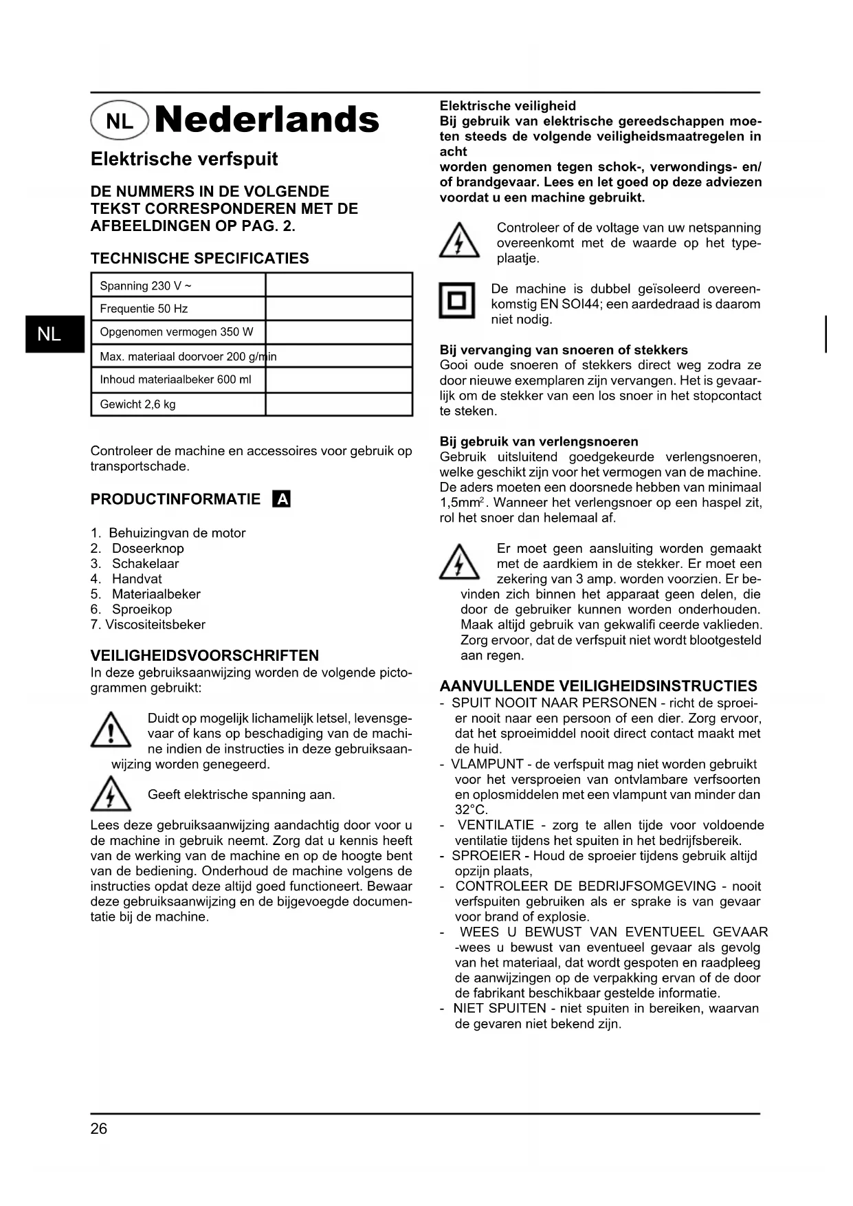 . Wanneer het verlengsnoer op een haspel zit, rol het snoer dan helemaal af. Er moet geen aansluiting worden gemaakt met de aardkiem in de stekker. Er moet een zekering van 3 amp. worden voorzien. Er be- vinden zich binnen het apparaat geen delen, die door de gebruiker kunnen worden onderhouden. Maak altijd gebruik van gekwalifi ceerde vaklieden. Zorg ervoor, dat de verfspuit niet wordt blootgesteld aan regen. AANVULLENDE VEILIGHEIDSINSTRUCTIES - SPUIT NOOIT NAAR PERSONEN - richt de sproei- er nooit naar een persoon of een dier. Zorg ervoor, dat het sproeimiddel nooit direct contact maakt met de huid. - VLAMPUNT - de verfspuit mag niet worden gebruikt voor het versproeien van ontvlambare verfsoorten en oplosmiddelen met een vlampunt van minder dan 32°C. - VENTILATIE - zorg te allen tijde voor voldoende ventilatie tijdens het spuiten in het bedrijfsbereik. - SPROEIER - Houd de sproeier tijdens gebruik altijd opzijn plaats, - CONTROLEER DE BEDRIJFSOMGEVING - nooit verfspuiten gebruiken als er sprake is van gevaar voor brand of explosie.