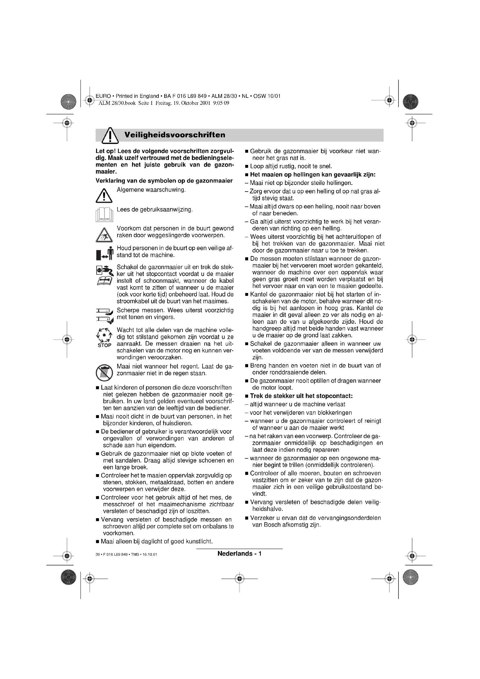 ga- rantito è minore di 96 dB (A). Procedimento di valu- tazione della conformità secondo appendice VIII. Ufficio di sorveglianza tecnica: SRL, Sudbury En- gland Leinfelden, 10.10.2001. Dr. Gerhard Felten Dr. Eckerhard Strötgen Robert Bosch GmbH, Geschäftsbereich Elektrowerkzeuge Con riserva di modifiche Garanzia Misure ecologiche Centro di Assistenza Clienti Dichiarazione di conformità ALM 28/30.book Seite 6 Freitag, 19. Oktober 2001 9:05 09 38 • F 016 L69 849 • TMS • 16.10.01EURO • Printed in England • BA F 016 L69 849 • ALM 28/30 • NL • OSW 10/01 Nederlands - 1 Let op! Lees de volgende voorschriften zorgvul- dig. Maak uzelf vertrouwd met de bedieningsele- menten en het juiste gebruik van de gazon- maaier. Verklaring van de symbolen op de gazonmaaier Algemene waarschuwing. Lees de gebruiksaanwijzing. Voorkom dat personen in de buurt gewond raken door weggeslingerde voorwerpen. Houd personen in de buurt op een veilige af- stand tot de machine. Schakel de gazonmaaier uit en trek de stek- ker uit het stopcontact voordat u de maaier instelt of schoonmaakt, wanneer de kabel vast komt te zitten of wanneer u de maaier (ook voor korte tijd) onbeheerd laat. Houd de stroomkabel uit de buurt van het maaimes. Scherpe messen. Wees uiterst voorzichtig met tenen en vingers. Wacht tot alle delen van de machine volle- dig tot stilstand gekomen zijn voordat u ze aanraakt. De messen draaien na het uit- schakelen van de motor nog en kunnen ver- wondingen veroorzaken. Maai niet wanneer het regent. Laat de ga- zonmaaier niet in de regen staan. ■ Laat kinderen of personen die deze voorschriften niet gelezen hebben de gazonmaaier nooit ge- bruiken. In uw land gelden eventueel voorschrif- ten ten aanzien van de leeftijd van de bediener. ■ Maai nooit dicht in de buurt van personen, in het bijzonder kinderen, of huisdieren. ■ De bediener of gebruiker is verantwoordelijk voor ongevallen of verwondingen van anderen of schade aan hun eigendom. ■ Gebruik de gazonmaaier niet op blote voeten of met sandalen. Draag altijd stevige schoenen en een lange broek. ■ Controleer het te maaien oppervlak zorgvuldig op stenen, stokken, metaaldraad, botten en andere voorwerpen en verwijder deze. ■ Controleer voor het gebruik altijd of het mes, de messchroef of het maaimechanisme zichtbaar versleten of beschadigd zijn of loszitten. ■ Vervang versleten of beschadigde messen en schroeven altijd per complete set om onbalans te voorkomen. ■ Maai alleen bij daglicht of goed kunstlicht. ■ Gebruik de gazonmaaier bij voorkeur niet wan- neer het gras nat is. ■ Loop altijd rustig, nooit te snel. ■ Het maaien op hellingen kan gevaarlijk zijn: – Maai niet op bijzonder steile hellingen. – Zorg ervoor dat u op een helling of op nat gras al- tijd stevig staat. – Maai altijd dwars op een helling, nooit naar boven of naar beneden. – Ga altijd uiterst voorzichtig te werk bij het veran- deren van richting op een helling. – Wees uiterst voorzichtig bij het achteruitlopen of bij het trekken van de gazonmaaier. Maai niet door de gazonmaaier naar u toe te trekken. ■ De messen moeten stilstaan wanneer de gazon- maaier bij het vervoeren moet worden gekanteld, wanneer de machine over een oppervlak waar geen gras groeit moet worden verplaatst en bij het vervoer naar en van een te maaien gedeelte. ■ Kantel de gazonmaaier niet bij het starten of in- schakelen van de motor, behalve wanneer dit no- dig is bij het aanlopen in hoog gras. Kantel de maaier in dit geval alleen zo ver als nodig en al- leen aan de van u afgekeerde zijde. Houd de handgreep altijd met beide handen vast wanneer u de maaier op de grond laat zakken. ■ Schakel de gazonmaaier alleen in wanneer uw voeten voldoende ver van de messen verwijderd zijn. ■ Breng handen en voeten niet in de buurt van of onder ronddraaiende delen. ■ De gazonmaaier nooit optillen of dragen wanneer de motor loopt. ■ Trek de stekker uit het stopcontact: – altijd wanneer u de machine verlaat – voor het verwijderen van blokkeringen – wanneer u de gazonmaaier controleert of reinigt of wanneer u aan de maaier werkt – na het raken van een voorwerp. Controleer de ga- zonmaaier onmiddellijk op beschadigingen en laat deze indien nodig repareren – wanneer de gazonmaaier op een ongewone ma- nier begint te trillen (onmiddellijk controleren). ■ Controleer of alle moeren, bouten en schroeven vastzitten om er zeker van te zijn dat de gazon- maaier zich in een veilige gebruikstoestand be- vindt. ■ Vervang versleten of beschadigde delen veilig- heidshalve. ■ Verzeker u ervan dat de vervangingsonderdelen van Bosch afkomstig zijn. Veiligheidsvoorschriften STOP ALM 28/30.book Seite 1 Freitag, 19. Oktober 2001 9:05 09 39 • F 016 L69 849 • TMS • 16.10.01EURO • Printed in England • BA F 016 L69 849 • ALM 28/30 • NL • OSW 10/01 Nederlands - 2 Dit product is bestemd voor het maaien van gazons (uitsluitend particulier gebruik). Dit handboek bevat voorschriften over de juiste montage en het veilig gebruik van uw machine. Het is belangrijk dat u deze voorschriften zorgvuldig leest. De machine weegt in compleet gemonteerde toe- stand ongeveer 4,6 kg. Vraag indien nodig hulp om de machine uit de verpakking te nemen. Neem de gazonmaaier voorzichtig uit de verpak- king. Controleer of de volgende delen compleet zijn: – Fluistermaaier met duwstang – Een greepbeugelonderstuk – Twee schroeven – Twee vleugelmoeren – Twee bouten – Twee kabelclips – Gebruiksaanwijzing Neem contact op met uw leverancier wanneer onderdelen ontbreken of beschadigd zijn. 1 Schakelhendel 2 Veiligheidsknop 3 Greepbeugel-bovenstuk 4 Netstekker** 5 Kabeltrekontlasting 6 Onderstuk van greepbeugel ** verschilt per land In de gebruiksaanwijzing afgebeeld en beschreven toebehoren wordt niet altijd standaard meegeleverd. Elektrische veiligheid Uw machine is voor extra veiligheid dubbel geïso- leerd en heeft geen aardverbinding nodig. De be- drijfsspanning bedraagt 230 V wissels