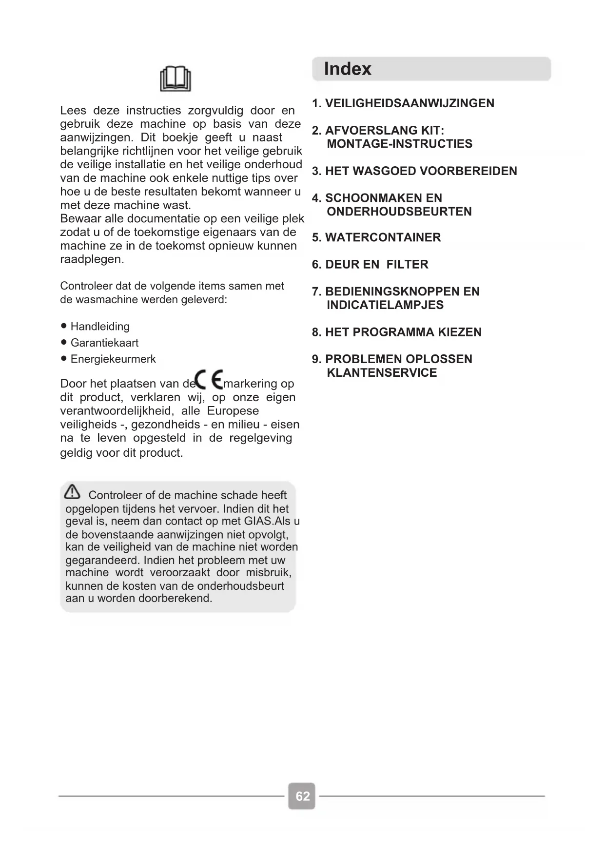 Index Lees deze instructies zorgvuldig door en gebruik deze machine op basis van deze aanwijzingen. Dit boekje geeft u naast belangrijke richtlijnen voor het veilige gebruik de veilige installatie en het veilige onderhoud van de machine ook enkele nuttige tips over hoe u de beste resultaten bekomt wanneer u met deze machine wast. Bewaar alle documentatie op een veilige plek zodat u of de toekomstige eigenaars van de machine ze in de toekomst opnieuw kunnen raadplegen. Controleer dat de volgende items samen met de wasmachine werden geleverd: ● Handleiding ● Garantiekaart ● Energiekeurmerk Door het plaatsen van de markering op dit product, verklaren wij, op onze eigen verantwoordelijkheid, alle Europese veiligheids -, gezondheids - en milieu - eisen na te leven opgesteld in de regelgeving geldig voor dit product. Controleer of de machine schade heeft opgelopen tijdens het vervoer. Indien dit het geval is, neem dan contact op met GIAS.Als u de bovenstaande aanwijzingen niet opvolgt, kan de veiligheid van de machine niet worden gegarandeerd. Indien het probleem met uw machine wordt veroorzaakt door misbruik, kunnen de kosten van de onderhoudsbeurt aan u worden doorberekend.1. VEILIGHEIDSAANWIJZINGEN2. AFVOERSLANG KIT: MONTAGE-INSTRUCTIES3. HET WASGOED VOORBEREIDEN4. SCHOONMAKEN EN ONDERHOUDSBEURTEN5. WATERCONTAINER