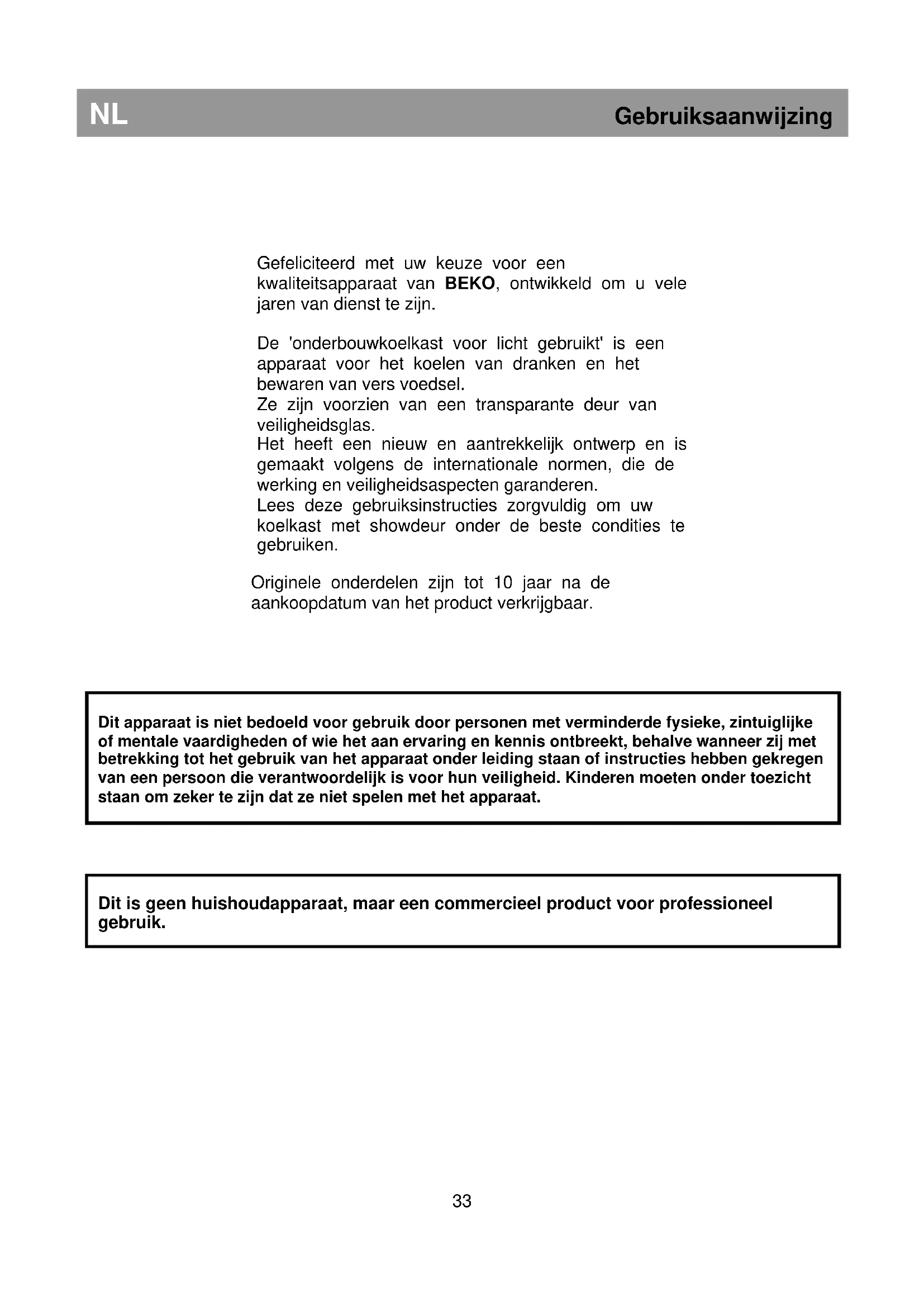 bevestigt u de accessoires op hun plaats en sluit u het apparaat aan op de stroom. Probleemoploshandleiding Het apparaat werkt niet Er is een stroomonderbreking. De stekker of het voedingssnoer is niet goed in het stopcontact gestoken. De zekering is gesprongen. De thermostaten staan op de stopstand (O). Het apparaat koelt niet Er was gedurende langere tijd een stroomonderbreking. Er werd vers voedsel geplaatst voor invriezing. Het apparaat is niet juist geplaatst. Het apparaat is te dicht bij een warmtebron geplaatst. De thermostaatknop staat niet op de juiste stand. De omgevingstemperatuur is te hoog. De binnenverlichting werkt niet als de compressor draait De schakelaar staat op de uitstand of is buiten gebruik. De schakelaar werkt niet. De lamp is doorgebrand. Contact op met uw bevoegde servicedienst. Het apparaat is te luidruchtig Het apparaat is niet juist geplaatst. De achterleidingen raken elkaar of trillen. Er is contact tussen de flessen of andere potten in de koelkast. Er staat water in kastrichel. Het waterafvoerkanaal zit verstopt. Als u de bovenstaande informatie opvolgt en de storing niet kunt vinden, neem dan contact op met de servicedienst. Waarschuwing! Probeer onder geen enkel beding zelf het apparaat of zijn elektrische onderdelen te repareren. Elke reparatie die door een onbevoegd persoon wordt uitgevoerd is gevaarlijk voor de gebruiker en kan de garantie laten vervallen. 37Urime për zgjedhjen tuaj në Pajisjen e Cilësisë BEKO, të ndërtuar për t'ju dhënë shumë vjet shërbim. “Frigorifer banak për punë të lehta” janë pajisje për të ftohur pije dhe për të mbajtur ushqime të freskëta. Ato janë të pajisura me derë transparente prej xhami sigurie. Ka një ndërtim të ri dhe tërheqës dhe është prodhuar sipas rregullave ndërkombëtare të cilat ju garantojnë kapacitete punimi dhe sigurie. Për ta përdorur frigoriferin tuaj 'dritare ekspozimi' në kushtet më të mira, ju lutem lexoni me kujdes këto udhëzime përdorimi. Pjesët origjinale të ndërrimit do të ofrohen për 10 vite, pas datës së blerjes së produktit