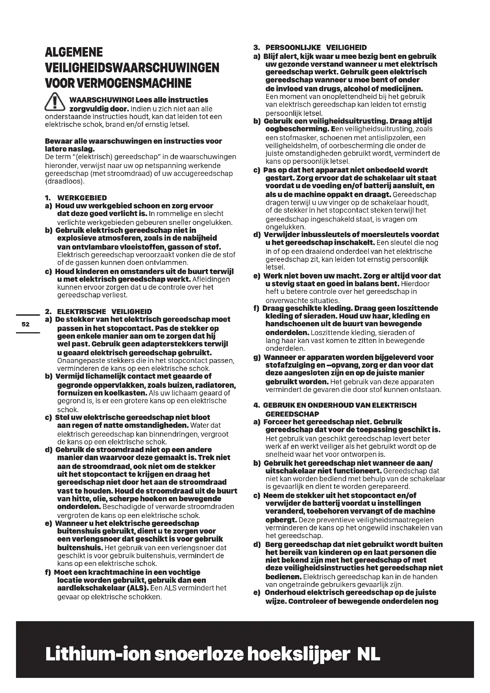 GEREEDSCHAP a) Forceer het gereedschap niet. Gebruik gereedschap dat voor de toepassing geschikt is. Het gebruik van geschikt gereedschap levert beter werk af en werkt veiliger als het gebruikt wordt op de snelheid waar het voor ontworpen is. b) Gebruik het gereedschap niet wanneer de aan/ uitschakelaar niet functioneert. Gereedschap dat niet kan worden bediend met behulp van de schakelaar is gevaarlijk en dient te worden gerepareerd. c) Neem de stekker uit het stopcontact en/of verwijder de batterij voordat u instellingen veranderd, toebehoren vervangt of de machine opbergt. Deze preventieve veiligheidsmaatregelen verminderen de kans op het ongewild inschakelen van het gereedschap. d) Berg gereedschap dat niet gebruikt wordt buiten het bereik van kinderen op en laat personen die niet bekend zijn met het gereedschap of met deze veiligheidsinstructies het gereedschap niet bedienen. Elektrisch gereedschap kan in de handen van ongetrainde gebruikers gevaarlijk zijn. e) Onderhoud elektrisch gereedschap op de juiste wijze. Controleer of bewegende onderdelen nogLithium-ion snoerloze hoekslijper NL