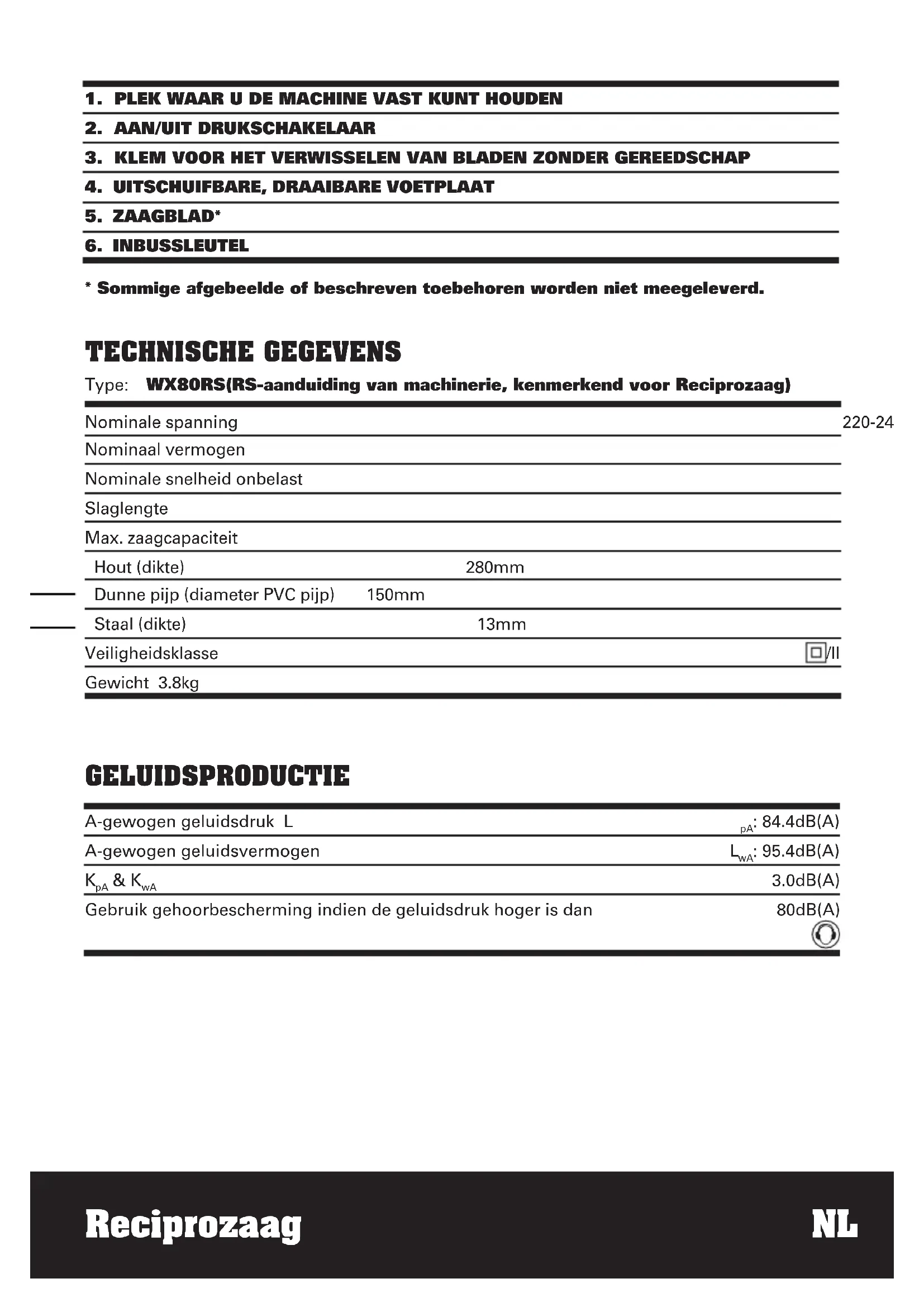 - Sommige afgebeelde of beschreven toebehoren worden niet meegeleverd. TECHNISCHE GEGEVENS Type: WX80RS(RS-aanduiding van machinerie, kenmerkend voor Reciprozaag) Nominale spanning 220-240V~50/60Hz Nominaal vermogen 800W Nominale snelheid onbelast 0-2600/min Slaglengte 28mm Max. zaagcapaciteit Hout (dikte) 280mm Dunne pijp (diameter PVC pijp) 150mm Staal (dikte) 13mm Veiligheidsklasse /II Gewicht 3.8kg A-gewogen geluidsdruk L