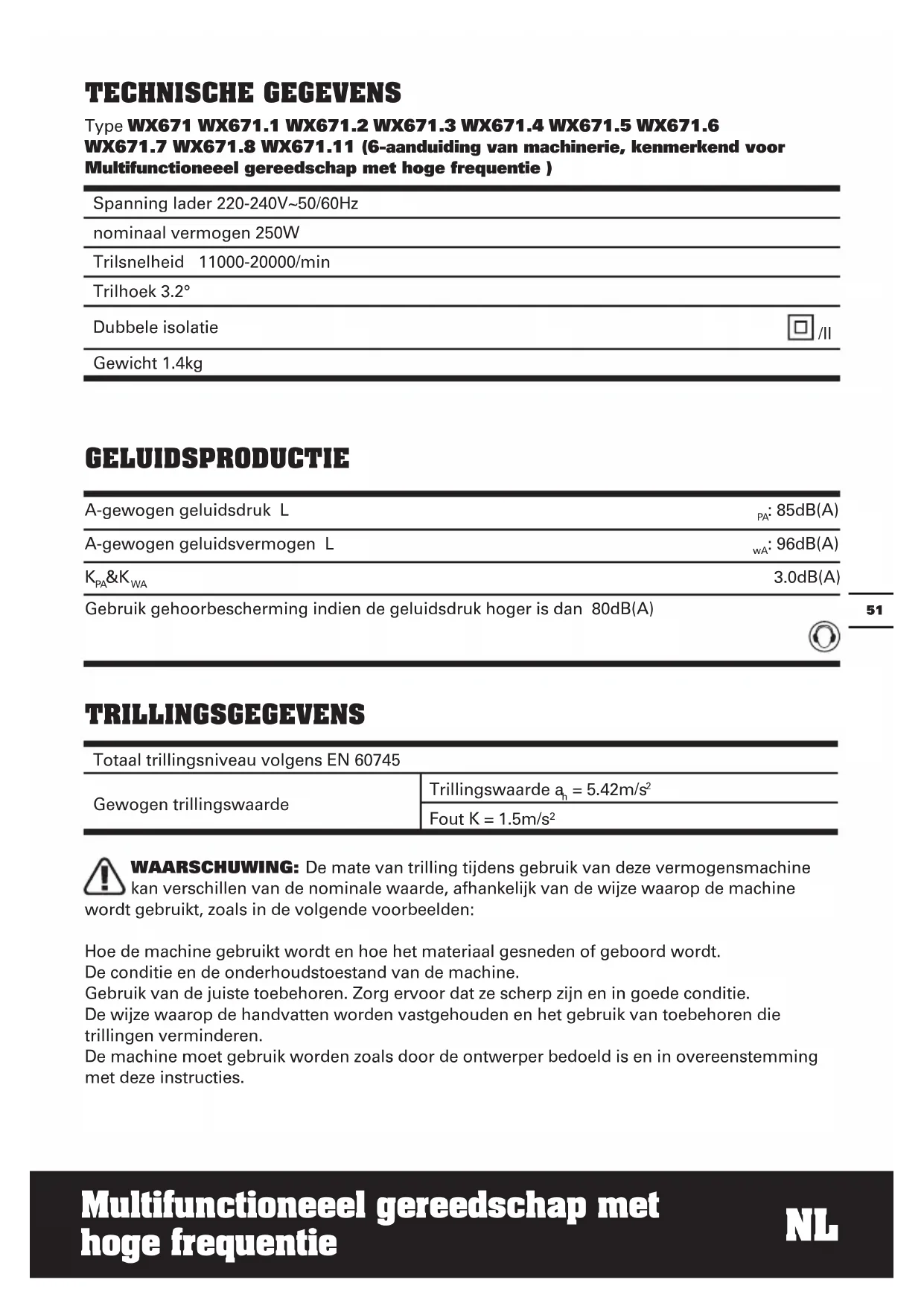 Fout K = 1.5m/s² WAARSCHUWING: De mate van trilling tijdens gebruik van deze vermogensmachine kan verschillen van de nominale waarde, afhankelijk van de wijze waarop de machine wordt gebruikt, zoals in de volgende voorbeelden: Hoe de machine gebruikt wordt en hoe het materiaal gesneden of geboord wordt. De conditie en de onderhoudstoestand van de machine. Gebruik van de juiste toebehoren. Zorg ervoor dat ze scherp zijn en in goede conditie. De wijze waarop de handvatten worden vastgehouden en het gebruik van toebehoren die trillingen verminderen. De machine moet gebruik worden zoals door de ontwerper bedoeld is en in overeenstemming met deze instructies. Spanning lader 220-240V~50/60Hz nominaal vermogen 250W Trilsnelheid 11000-20000/min Trilhoek 3.2° Dubbele isolatie /II Gewicht 1.4kgNL