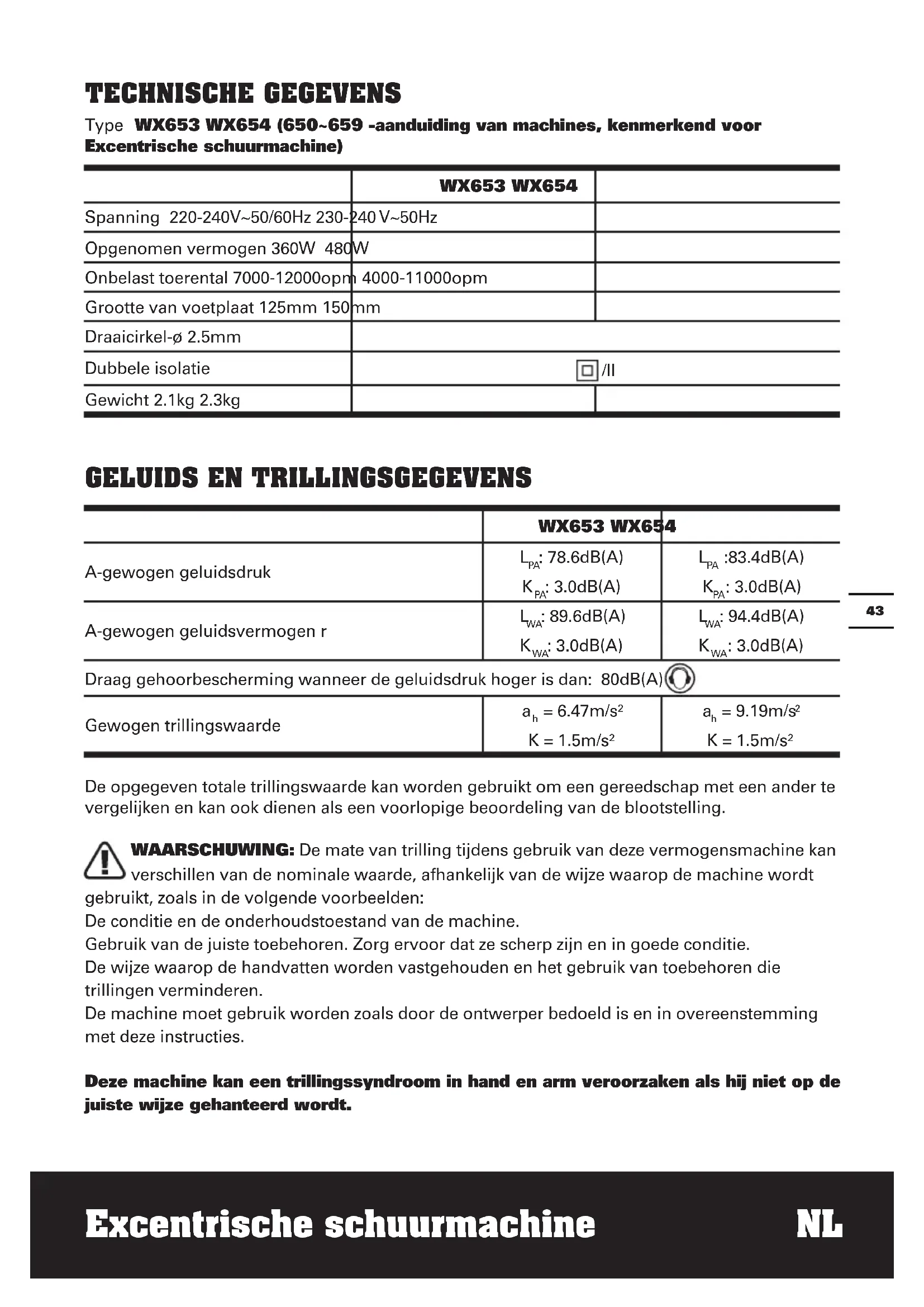 WAARSCHUWING: De mate van trilling tijdens gebruik van deze vermogensmachine kan verschillen van de nominale waarde, afhankelijk van de wijze waarop de machine wordt
