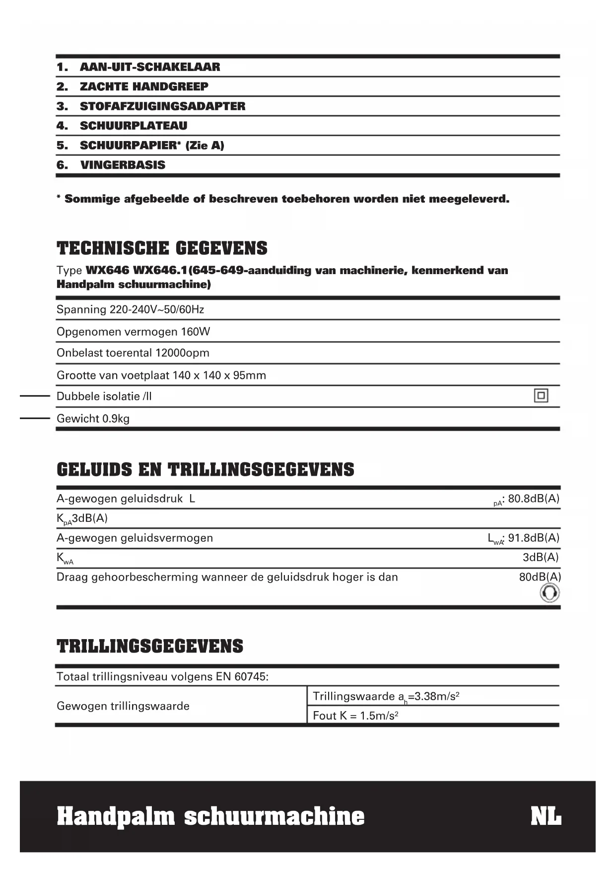 - Sommige afgebeelde of beschreven toebehoren worden niet meegeleverd. Spanning 220-240V~50/60Hz Opgenomen vermogen 160W Onbelast toerental 12000opm Grootte van voetplaat 140 x 140 x 95mm Dubbele isolatie /ll Gewicht 0.9kg TECHNISCHE GEGEVENS Type WX646 WX646.1(645-649-aanduiding van machinerie, kenmerkend van Handpalm schuurmachine)