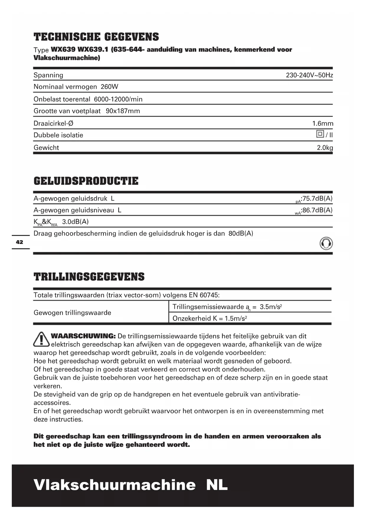 TECHNISCHE GEGEVENS Type WX639 WX639.1 (635-644- aanduiding van machines, kenmerkend voor Vlakschuurmachine) Spanning 230-240V~50Hz Nominaal vermogen 260W Onbelast toerental 6000-12000/min Grootte van voetplaat 90x187mm Draaicirkel-Ø 1.6mm Dubbele isolatie / II Gewicht 2.0kg GELUIDSPRODUCTIE A-gewogen geluidsdruk L