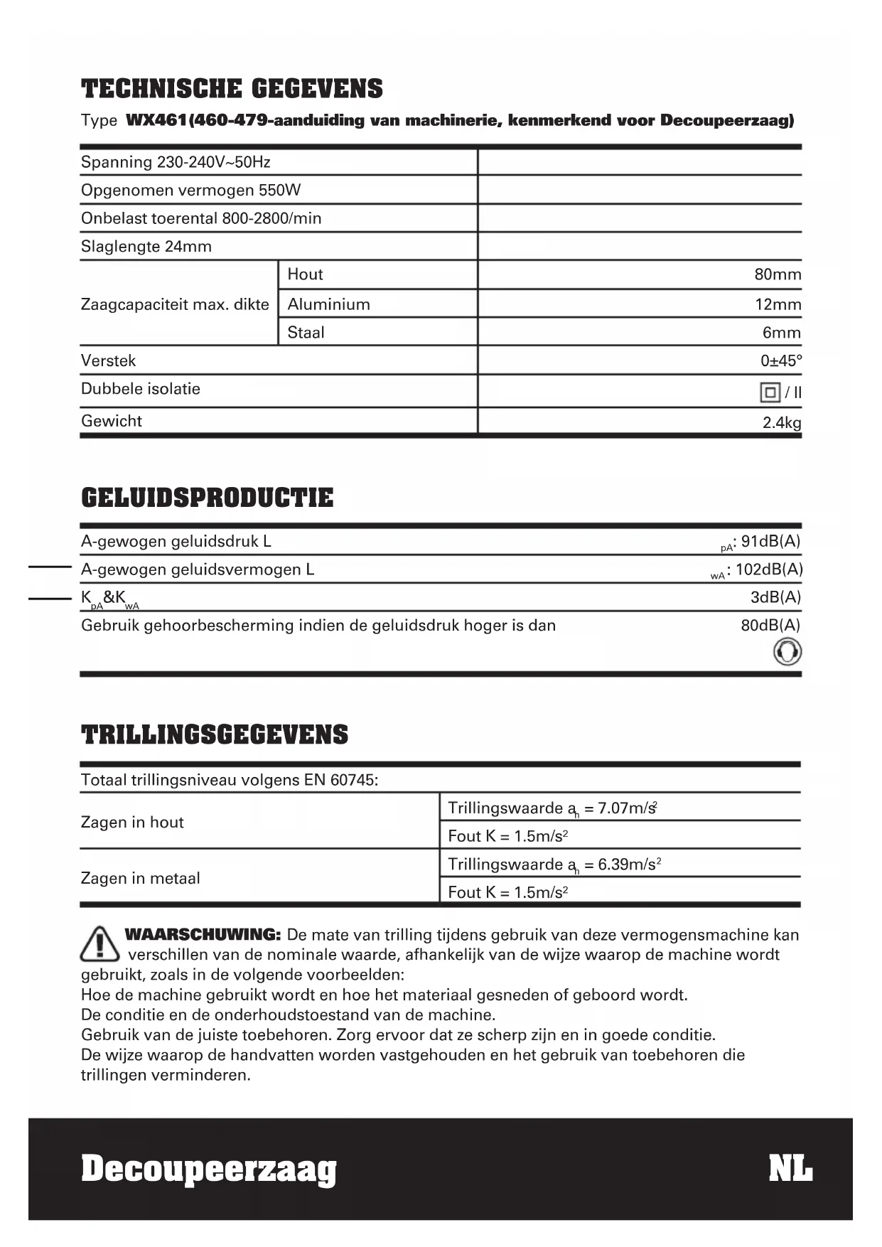 TECHNISCHE GEGEVENS Type WX461(460-479-aanduiding van machinerie, kenmerkend voor Decoupeerzaag) Spanning 230-240V~50Hz Opgenomen vermogen 550W Onbelast toerental 800-2800/min Slaglengte 24mm Zaagcapaciteit max. dikte Hout 80mm Aluminium 12mm Staal 6mm Verstek 0±45° Dubbele isolatie / II Gewicht 2.4kg GELUIDSPRODUCTIE A-gewogen geluidsdruk L
