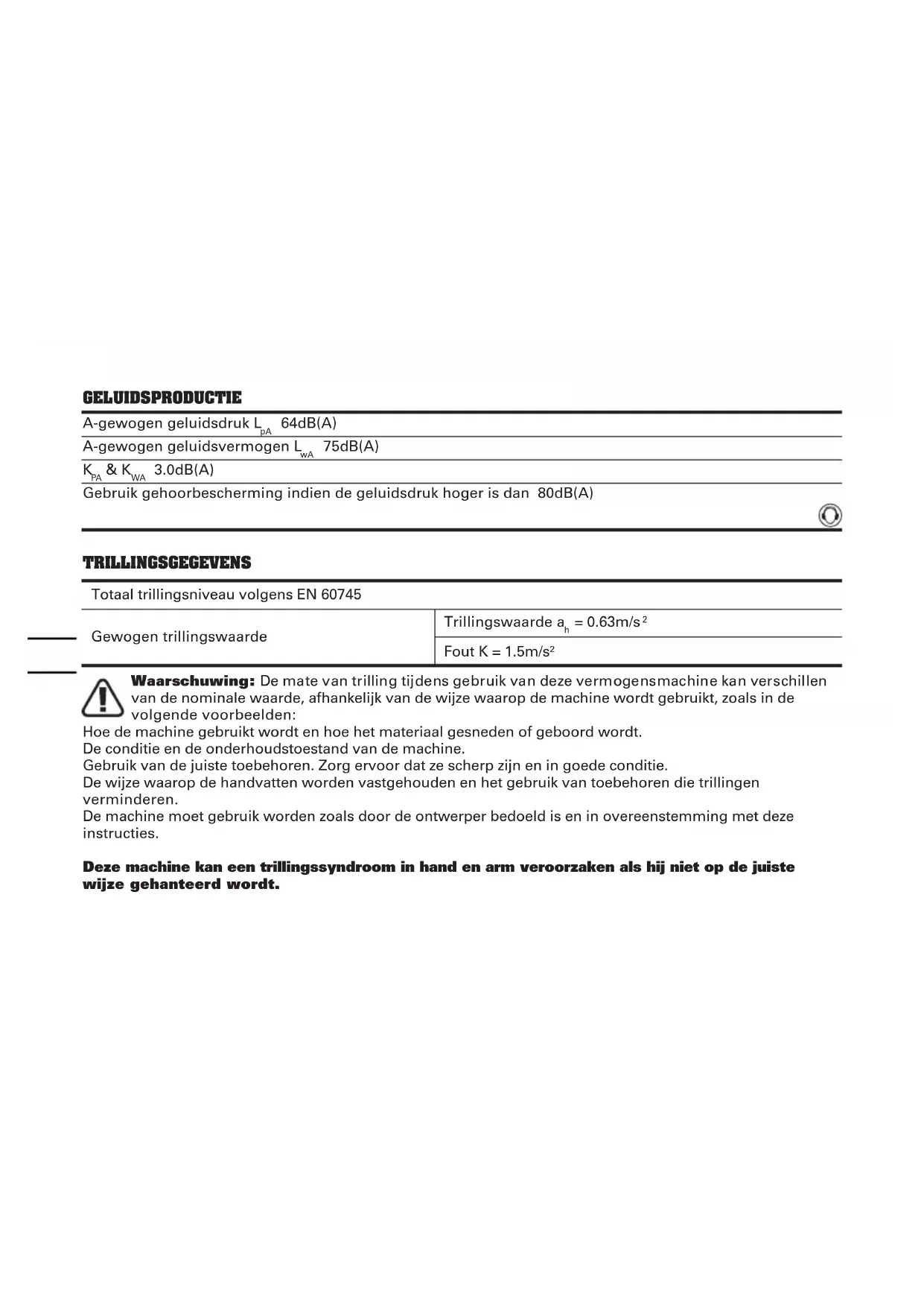 Fout K = 1.5m/s² Waarschuwing: De mate van trilling tijdens gebruik van deze vermogensmachine kan verschillen van de nominale waarde, afhankelijk van de wijze waarop de machine wordt gebruikt, zoals in de volgende voorbeelden: Hoe de machine gebruikt wordt en hoe het materiaal gesneden of geboord wordt. De conditie en de onderhoudstoestand van de machine. Gebruik van de juiste toebehoren. Zorg ervoor dat ze scherp zijn en in goede conditie. De wijze waarop de handvatten worden vastgehouden en het gebruik van toebehoren die trillingen verminderen. De machine moet gebruik worden zoals door de ontwerper bedoeld is en in overeenstemming met deze instructies. Deze machine kan een trillingssyndroom in hand en arm veroorzaken als hij niet op de juiste wijze gehanteerd wordt. A-gewogen geluidsdruk L