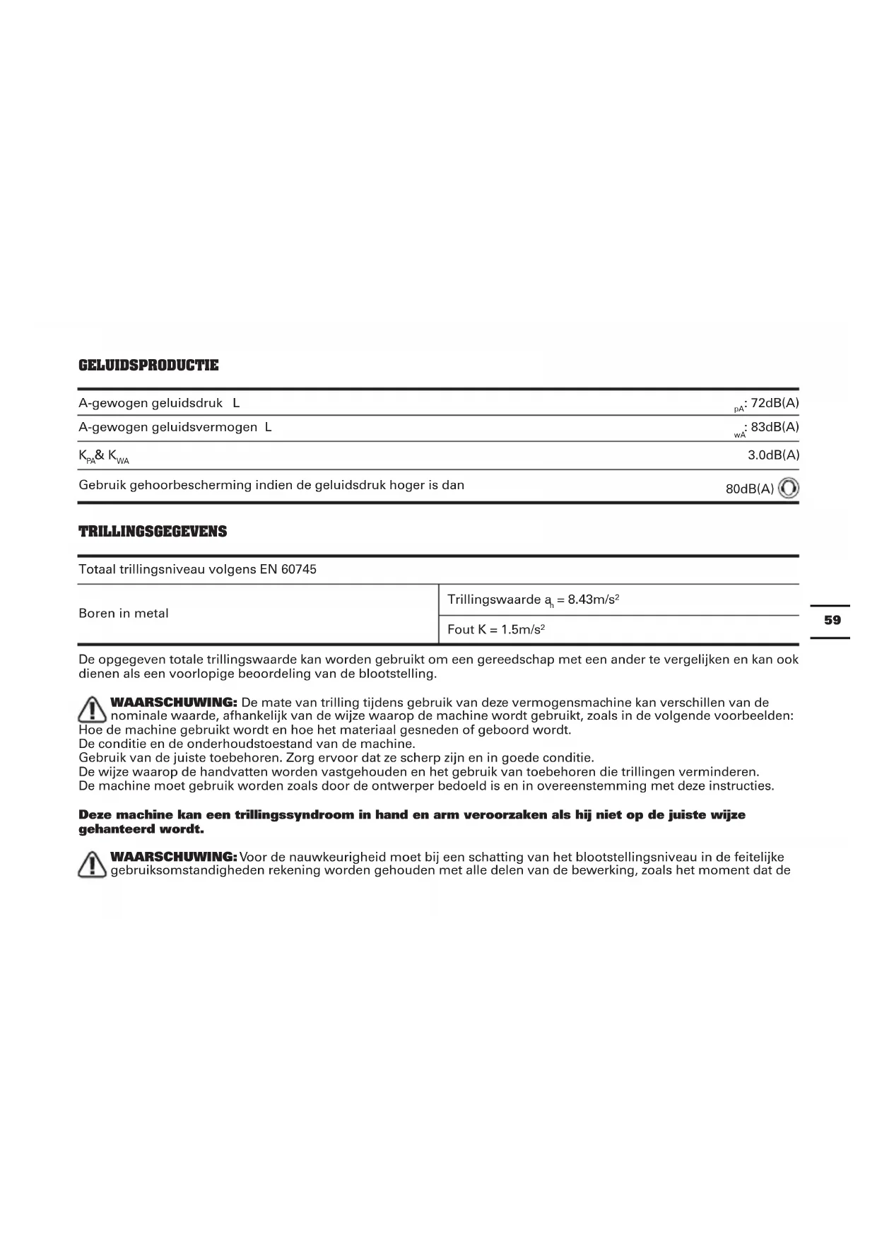3.0dB(A) Gebruik gehoorbescherming indien de geluidsdruk hoger is dan 80dB(A) TRILLINGSGEGEVENS Totaal trillingsniveau volgens EN 60745 Boren in metal Trillingswaarde a