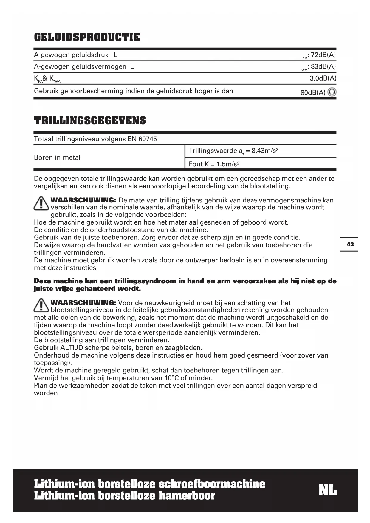 = 8.43m/s² Fout K = 1.5m/s² De opgegeven totale trillingswaarde kan worden gebruikt om een gereedschap met een ander te vergelijken en kan ook dienen als een voorlopige beoordeling van de blootstelling. WAARSCHUWING: De mate van trilling tijdens gebruik van deze vermogensmachine kan verschillen van de nominale waarde, afhankelijk van de wijze waarop de machine wordt gebruikt, zoals in de volgende voorbeelden: Hoe de machine gebruikt wordt en hoe het materiaal gesneden of geboord wordt. De conditie en de onderhoudstoestand van de machine. Gebruik van de juiste toebehoren. Zorg ervoor dat ze scherp zijn en in goede conditie. De wijze waarop de handvatten worden vastgehouden en het gebruik van toebehoren die trillingen verminderen. De machine moet gebruik worden zoals door de ontwerper bedoeld is en in overeenstemming met deze instructies. Deze machine kan een trillingssyndroom in hand en arm veroorzaken als hij niet op de juiste wijze gehanteerd wordt. WAARSCHUWING: Voor de nauwkeurigheid moet bij een schatting van het blootstellingsniveau in de feitelijke gebruiksomstandigheden rekening worden gehouden met alle delen van de bewerking, zoals het moment dat de machine wordt uitgeschakeld en de tijden waarop de machine loopt zonder daadwerkelijk gebruikt te worden. Dit kan het blootstellingsniveau over de totale werkperiode aanzienlijk verminderen. De blootstelling aan trillingen verminderen. Gebruik ALTIJD scherpe beitels, boren en zaagbladen. Onderhoud de machine volgens deze instructies en houd hem goed gesmeerd (voor zover van toepassing). Wordt de machine geregeld gebruikt, schaf dan toebehoren tegen trillingen aan. Vermijd het gebruik bij temperaturen van 10°C of minder. Plan de werkzaamheden zodat de taken met veel trillingen over een aantal dagen verspreid wordenNL