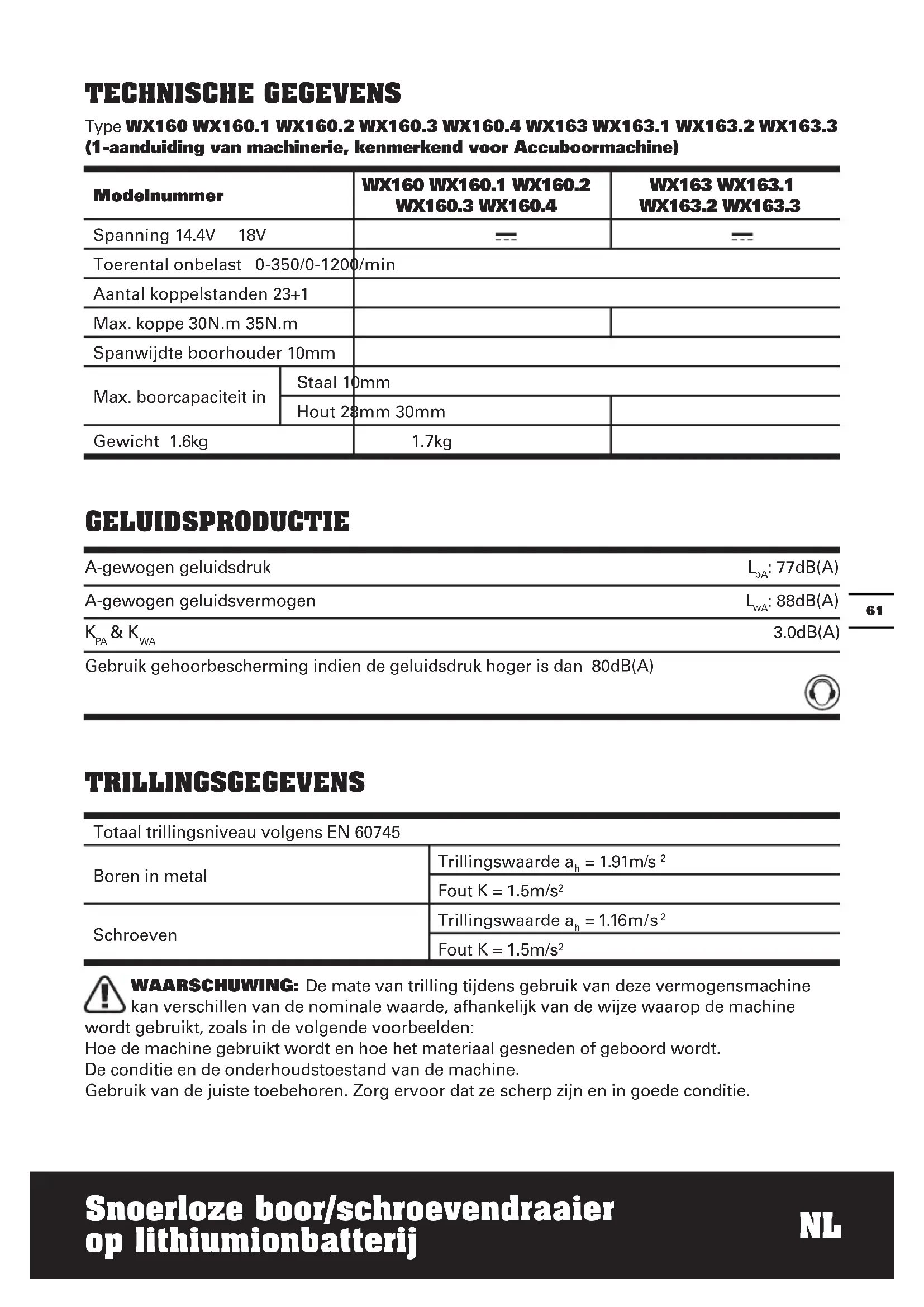 Fout K = 1.5m/s² WAARSCHUWING: De mate van trilling tijdens gebruik van deze vermogensmachine kan verschillen van de nominale waarde, afhankelijk van de wijze waarop de machine wordt gebruikt, zoals in de volgende voorbeelden: Hoe de machine gebruikt wordt en hoe het materiaal gesneden of geboord wordt. De conditie en de onderhoudstoestand van de machine. Gebruik van de juiste toebehoren. Zorg ervoor dat ze scherp zijn en in goede conditie.62 Snoerloze boor/schroevendraaier op lithiumionbatterij