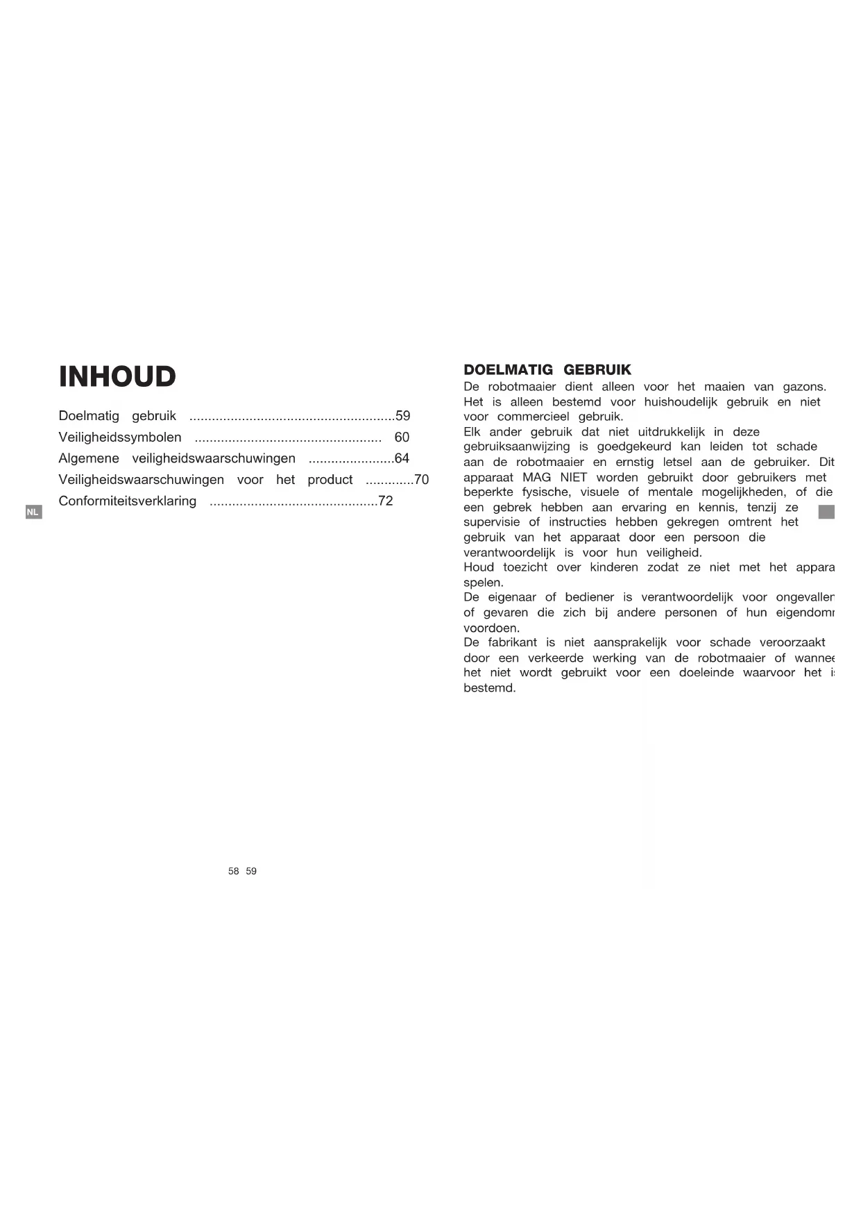 - EN 61000-3-3:2013/A1:2019 RoHS Directive 2011/65/EU Signature:________________________ Lieu: Saint Cyr Sur Loire Nom: Roland Menken Directrice générale Date: 2022-10-18 SUMEC France Sarl 59 bis Rue du Mûrier 37540 Saint Cyr Sur Loire France58 59 NL NL DOELMATIG GEBRUIK De robotmaaier dient alleen voor het maaien van gazons. Het is alleen bestemd voor huishoudelijk gebruik en niet voor commercieel gebruik. Elk ander gebruik dat niet uitdrukkelijk in deze gebruiksaanwijzing is goedgekeurd kan leiden tot schade aan de robotmaaier en ernstig letsel aan de gebruiker. Dit apparaat MAG NIET worden gebruikt door gebruikers met beperkte fysische, visuele of mentale mogelijkheden, of die een gebrek hebben aan ervaring en kennis, tenzij ze supervisie of instructies hebben gekregen omtrent het gebruik van het apparaat door een persoon die verantwoordelijk is voor hun veiligheid. Houd toezicht over kinderen zodat ze niet met het apparaat spelen. De eigenaar of bediener is verantwoordelijk voor ongevallen of gevaren die zich bij andere personen of hun eigendommen voordoen. De fabrikant is niet aansprakelijk voor schade veroorzaakt door een verkeerde werking van de robotmaaier of wanneer het niet wordt gebruikt voor een doeleinde waarvoor het is bestemd. INHOUD Doelmatig gebruik p. 59