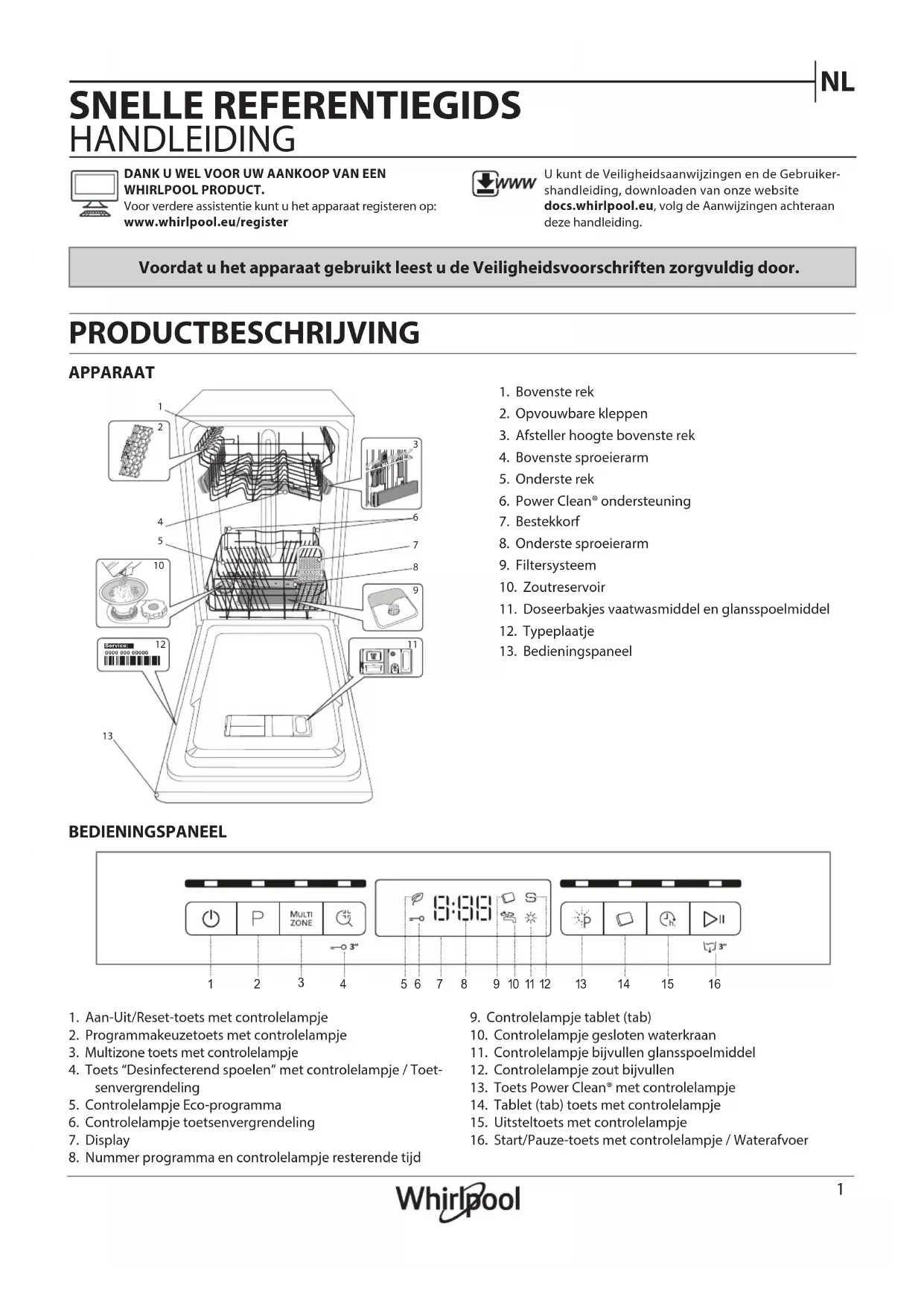 SNELLE REFERENTIEGIDS HANDLEIDING APPARAAT PRODUCTBESCHRIJVING Voordat u het apparaat gebruikt leest u de Veiligheidsvoorschriften zorgvuldig door. DANK U WEL VOOR UW AANKOOP VAN EENWHIRLPOOL PRODUCT. Voor verdere assistentie kunt u het apparaat registeren op:www.whirlpool.eu/registerU kunt de Veiligheidsaanwijzingen en de Gebruiker-shandleiding, downloaden van onze website docs.whirlpool.eu, volg de Aanwijzingen achteraan deze handleiding.1. Bovenste rek2. Opvouwbare kleppen3. Afsteller hoogte bovenste rek4. Bovenste sproeierarm5. Onderste rek6. Power Clean® ondersteuning7. Bestekkorf8. Onderste sproeierarm9. Filtersysteem10. Zoutreservoir11. Doseerbakjes vaatwasmiddel en glansspoelmiddel12. Typeplaatje13. Bedieningspaneel1. Aan-Uit/Reset-toets met controlelampje2. Programmakeuzetoets met controlelampje3. Multizone toets met controlelampje4. Toets “Desinfecterend spoelen” met controlelampje / Toet-senvergrendeling5. Controlelampje Eco-programma6. Controlelampje toetsenvergrendeling7. Display8. Nummer programma en controlelampje resterende tijd9. Controlelampje tablet (tab) 10. Controlelampje gesloten waterkraan11. Controlelampje bijvullen glansspoelmiddel12. Controlelampje zout bijvullen13. Toets Power Clean® met controlelampje14. Tablet (tab) toets met controlelampje15. Uitsteltoets met controlelampje16. Start/Pauze-toets met controlelampje / Waterafvoer BEDIENINGSPANEEL