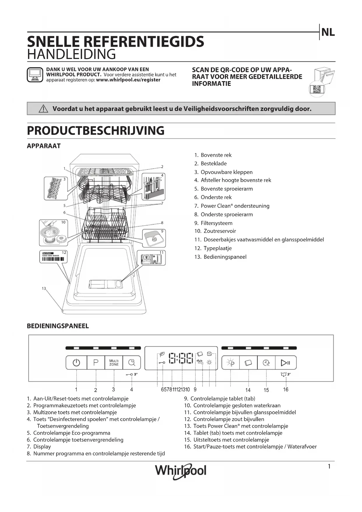 SNELLE REFERENTIEGIDS HANDLEIDING APPARAAT PRODUCTBESCHRIJVING DANK U WEL VOOR UW AANKOOP VAN EEN WHIRLPOOL PRODUCT. Voor verdere assistentie kunt u het apparaat registeren op: www.whirlpool.eu/register1. Aan-Uit/Reset-toets met controlelampje2. Programmakeuzetoets met controlelampje3. Multizone toets met controlelampje4. Toets “Desinfecterend spoelen” met controlelampje / Toetsenvergrendeling5. Controlelampje Eco-programma6. Controlelampje toetsenvergrendeling7. Display8. Nummer programma en controlelampje resterende tijd9. Controlelampje tablet (tab) 10. Controlelampje gesloten waterkraan11. Controlelampje bijvullen glansspoelmiddel12. Controlelampje zout bijvullen13. Toets Power Clean® met controlelampje14. Tablet (tab) toets met controlelampje15. Uitsteltoets met controlelampje16. Start/Pauze-toets met controlelampje / Waterafvoer BEDIENINGSPANEEL 1. Bovenste rek2. Besteklade3. Opvouwbare kleppen4. Afsteller hoogte bovenste rek5. Bovenste sproeierarm6. Onderste rek7. Power Clean® ondersteuning8. Onderste sproeierarm9. Filtersysteem10. Zoutreservoir11. Doseerbakjes vaatwasmiddel en glansspoelmiddel12. Typeplaatje13. Bedieningspaneel