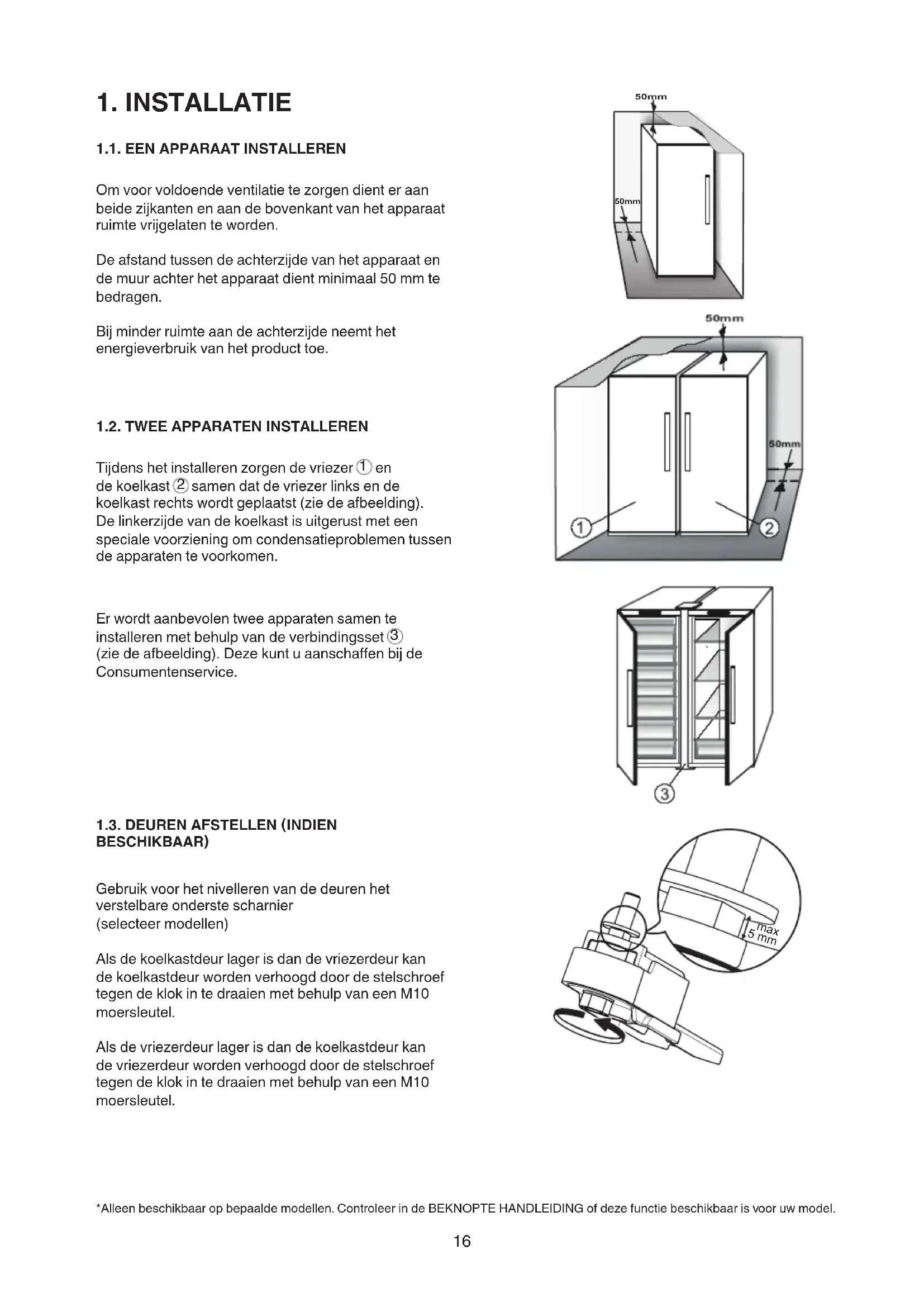 samen dat de vriezer links en de koelkast rechts wordt geplaatst (zie de afbeelding). De linkerzijde van de koelkast is uitgerust met een speciale voorziening om condensatieproblemen tussen de apparaten te voorkomen. Er wordt aanbevolen twee apparaten samen te installeren met behulp van de verbindingsset
