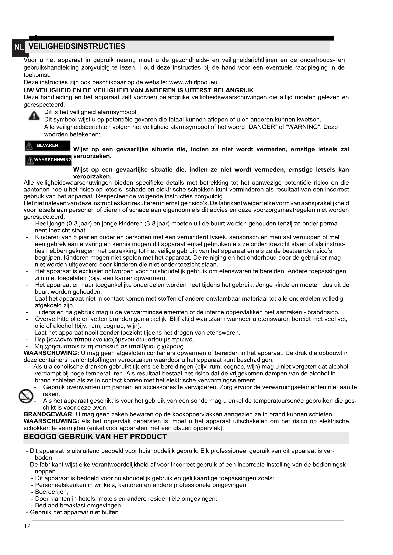 Voor u het apparaat in gebruik neemt, moet u de gezondheids- en veiligheidsrichtlijnen en de onderhouds- en gebruikshandleiding zorgvuldig te lezen. Houd deze instructies bij de hand voor een eventuele raadpleging in de toekomst. Deze instructies zijn ook beschikbaar op de website: www.whirlpool.eu UW VEILIGHEID EN DE VEILIGHEID VAN ANDEREN IS UITERST BELANGRIJK Deze handleiding en het apparaat zelf voorzien belangrijke veiligheidswaarschuwingen die altijd moeten gelezen en gerespecteerd. Dit is het veiligheid alarmsymbool. Dit symbool wijst u op potentiële gevaren die fataal kunnen aopen of u en anderen kunnen kwetsen. Alle veiligheidsberichten volgen het veiligheid alarmsymbool of het woord “DANGER” of “WARNING”. Deze woorden betekenen: Wijst op een gevaarlijke situatie die, indien ze niet wordt vermeden, ernstige letsels zal veroorzaken. Wijst op een gevaarlijke situatie die, indien ze niet wordt vermeden, ernstige letsels kan veroorzaken. Alle veiligheidswaarschuwingen bieden specieke details met betrekking tot het aanwezige potentiële risico en die aantonen hoe u het risico op letsels, schade en elektrische schokken kunt verminderen als resultaat van een incorrect gebruik van het apparaat. Respecteer de volgende instructies zorgvuldig. Het niet naleven van deze instructies kan resulteren in ernstige risico’s. De fabrikant weigert elke vorm van aansprakelijkheid voor letsels aan personen of dieren of schade aan eigendom als dit advies en deze voorzorgsmaatregelen niet worden gerespecteerd. - Heel jonge (0-3 jaar) en jonge kinderen (3-8 jaar) moeten uit de buurt worden gehouden tenzij ze onder perma- nent toezicht staat. - Kinderen van 8 jaar en ouder en personen met een verminderd fysiek, sensorisch en mentaal vermogen of met een gebrek aan ervaring en kennis mogen dit apparaat enkel gebruiken als ze onder toezicht staan of als instruc- ties hebben gekregen met betrekking tot het veilige gebruik van het apparaat en als ze de bestaande risico’s begrijpen. Kinderen mogen niet spelen met het apparaat. De reiniging en het onderhoud door de gebruiker mag niet worden uitgevoerd door kinderen die niet onder toezicht staan. - Het apparaat is exclusief ontworpen voor huishoudelijk gebruik om etenswaren te bereiden. Andere toepassingen zijn niet toegelaten (bijv. een kamer opwarmen). - Het apparaat en haar toegankelijke onderdelen worden heet tijdens het gebruik. Jonge kinderen moeten dus uit de buurt worden gehouden. - Laat het apparaat niet in contact komen met stoffen of andere ontvlambaar materiaal tot alle onderdelen volledig afgekoeld zijn. - Tijdens en na gebruik mag u de verwarmingselementen of de interne oppervlakken niet aanraken - brandrisico. - Oververhitte olie en vetten branden gemakkelijk. Blijf altijd waakzaam wanneer u etenswaren bereidt met veel vet, olie of alcohol (bijv. rum, cognac, wijn). - Laat het apparaat nooit zonder toezicht tijdens het drogen van etenswaren. - Περιβάλλοντα τύπου ενοικιαζόμενου δωματίου με πρωινό. - Μη χρησιμοποιείτε τη συσκευή σε υπαίθριους χώρους. WAARSCHUWING: U mag geen afgesloten containers opwarmen of bereiden in het apparaat. De druk die opbouwt in deze containers kan ontplofngen veroorzaken waardoor u het apparaat kunt beschadigen. - Als u alcoholische dranken gebruikt tijdens de bereidingen (bijv. rum, cognac, wijn) mag u niet vergeten dat alcohol verdampt bij hoge temperaturen. Als resultaat bestaat het risico dat de vrijgekomen dampen van de alcohol in brand schieten als ze in contact komen met het elektrische verwarmingselement. - Gebruik ovenwanten om pannen en accessoires te verwijderen. Zorg ervoor de verwarmingselementen niet aan te raken. - Als het apparaat geschikt is voor het gebruik van een sonde mag u enkel de temperatuursonde gebruiken die ges- chikt is voor deze oven. BRANDGEVAAR: U mag geen zaken bewaren op de kookoppervlakken aangezien ze in brand kunnen schieten. WAARSCHUWING: Als het oppervlak gebarsten is, moet u het apparaat uitschakelen om het risico op elektrische schokken te vermijden (enkel voor apparaten met een glazen oppervlak).