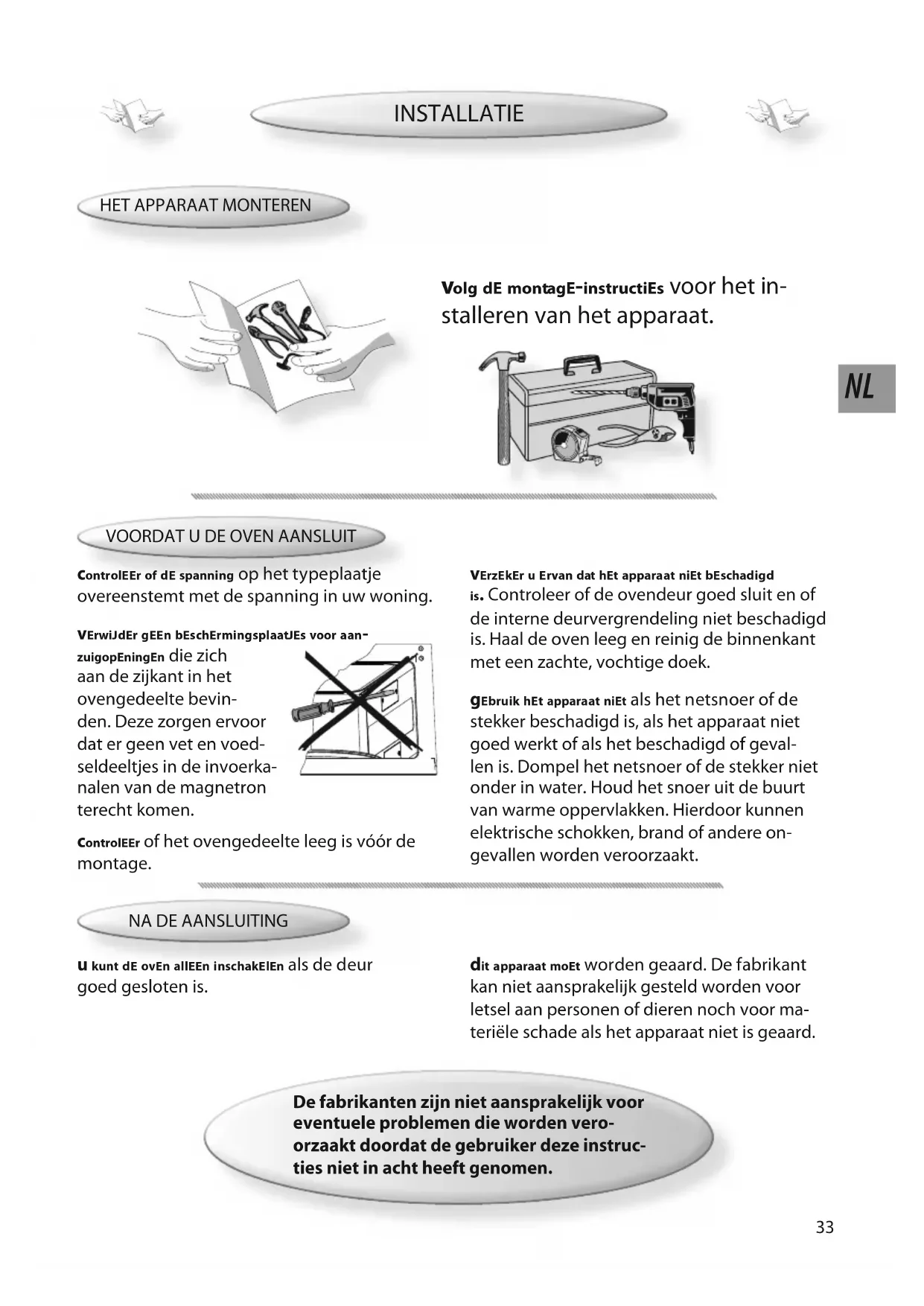 dit apparaat moEt worden geaard. De fabrikant kan niet aansprakelijk gesteld worden voor letsel aan personen of dieren noch voor ma- teriële schade als het apparaat niet is geaard. De fabrikanten zijn niet aansprakelijk voor eventuele problemen die worden vero- orzaakt doordat de gebruiker deze instruc- ties niet in acht heeft genomen. gEbruik hEt apparaat niEt als het netsnoer of de stekker beschadigd is, als het apparaat niet goed werkt of als het beschadigd of geval- len is. Dompel het netsnoer of de stekker niet onder in water. Houd het snoer uit de buurt van warme oppervlakken. Hierdoor kunnen elektrische schokken, brand of andere on- gevallen worden veroorzaakt. vErwiJdEr gEEn bEschErmingsplaatJEs voor aan- zuigopEningEn die zich aan de zijkant in het ovengedeelte bevin- den. Deze zorgen ervoor dat er geen vet en voed- seldeeltjes in de invoerka- nalen van de magnetron terecht komen. controlEEr of het ovengedeelte leeg is vóór de montage. controlEEr of dE spanning op het typeplaatje overeenstemt met de spanning in uw woning. u kunt dE ovEn allEEn inschakElEn als de deur goed gesloten is.