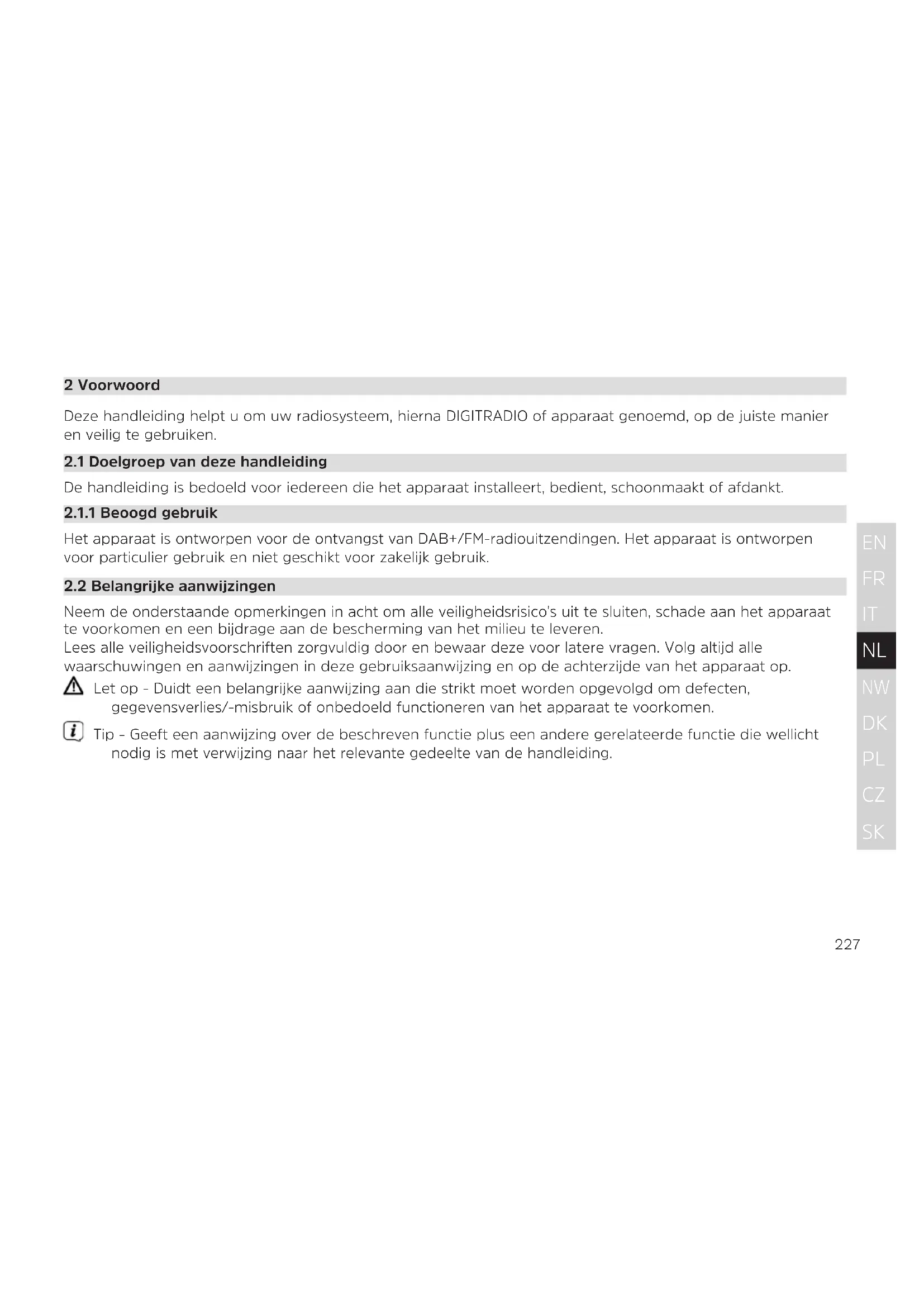 Neem de onderstaande opmerkingen in acht om alle veiligheidsrisico's uit te sluiten, schade aan het apparaat te voorkomen en een bijdrage aan de bescherming van het milieu te leveren. Lees alle veiligheidsvoorschriften zorgvuldig door en bewaar deze voor latere vragen. Volg altijd alle waarschuwingen en aanwijzingen in deze gebruiksaanwijzing en op de achterzijde van het apparaat op. Let op - Duidt een belangrijke aanwijzing aan die strikt moet worden opgevolgd om defecten, gegevensverlies/-misbruik of onbedoeld functioneren van het apparaat te voorkomen. Tip - Geeft een aanwijzing over de beschreven functie plus een andere gerelateerde functie die wellicht nodig is met verwijzing naar het relevante gedeelte van de handleiding.228