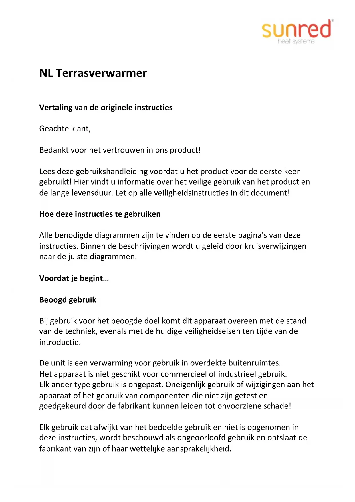 Vertaling van de originele instructies Geachte klant, Bedankt voor het vertrouwen in ons product! Lees deze gebruikshandleiding voordat u het product voor de eerste keer gebruikt! Hier vindt u informatie over het veilige gebruik van het product en de lange levensduur. Let op alle veiligheidsinstructies in dit document! Hoe deze instructies te gebruiken Alle benodigde diagrammen zijn te vinden op de eerste pagina's van deze instructies. Binnen de beschrijvingen wordt u geleid door kruisverwijzingen naar de juiste diagrammen. Voordat je begint… Beoogd gebruik Bij gebruik voor het beoogde doel komt dit apparaat overeen met de stand van de techniek, evenals met de huidige veiligheidseisen ten tijde van de introductie. De unit is een verwarming voor gebruik in overdekte buitenruimtes. Het apparaat is niet geschikt voor commercieel of industrieel gebruik. Elk ander type gebruik is ongepast. Oneigenlijk gebruik of wijzigingen aan het apparaat of het gebruik van componenten die niet zijn getest en goedgekeurd door de fabrikant kunnen leiden tot onvoorziene schade! Elk gebruik dat afwijkt van het bedoelde gebruik en niet is opgenomen in deze instructies, wordt beschouwd als ongeoorloofd gebruik en ontslaat de fabrikant van zijn of haar wettelijke aansprakelijkheid.Voor uw veiligheid Algemene veiligheidsinstructies