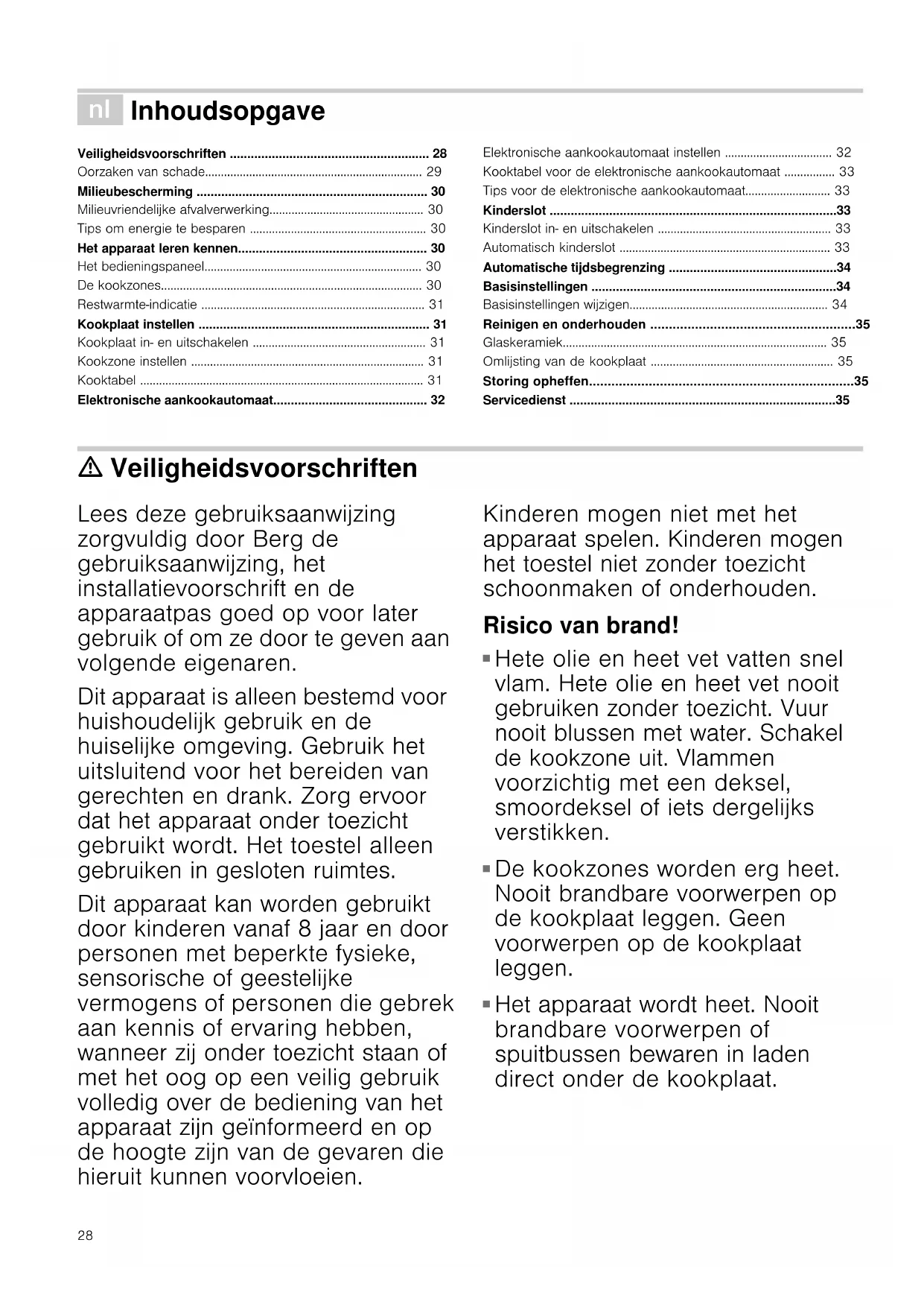 - Do not place hot pans close to or on the control panel28 é Inhoudsopgave [nl]Gebruiksaanwijzing Veiligheidsvoorschriften ......................................................... 28 Oorzaken van schade..................................................................... 29 Milieubescherming .................................................................. 30 Milieuvriendelijke afvalverwerking................................................. 30 Tips om energie te besparen ........................................................ 30 Het apparaat leren kennen...................................................... 30 Het bedieningspaneel..................................................................... 30 De kookzones................................................................................... 30 Restwarmte-indicatie ....................................................................... 31 Kookplaat instellen .................................................................. 31 Kookplaat in- en uitschakelen ....................................................... 31 Kookzone instellen .......................................................................... 31 Kooktabel .......................................................................................... 31 Elektronische aankookautomaat............................................ 32 Elektronische aankookautomaat instellen .................................. 32 Kooktabel voor de elektronische aankookautomaat ................ 33 Tips voor de elektronische aankookautomaat........................... 33 Kinderslot ..................................................................................33 Kinderslot in- en uitschakelen ....................................................... 33 Automatisch kinderslot ................................................................... 33 Automatische tijdsbegrenzing ................................................34 Basisinstellingen ......................................................................34 Basisinstellingen wijzigen............................................................... 34 Reinigen en onderhouden .......................................................35 Glaskeramiek.................................................................................... 35 Omlijsting van de kookplaat .......................................................... 35 Storing opheffen.......................................................................35 Servicedienst ............................................................................35 ã=Veiligheidsvoorschriften Lees deze gebruiksaanwijzing zorgvuldig door Berg de gebruiksaanwijzing, het installatievoorschrift en de apparaatpas goed op voor later gebruik of om ze door te geven aan volgende eigenaren. Dit apparaat is alleen bestemd voor huishoudelijk gebruik en de huiselijke omgeving. Gebruik het uitsluitend voor het bereiden van gerechten en drank. Zorg ervoor dat het apparaat onder toezicht gebruikt wordt. Het toestel alleen gebruiken in gesloten ruimtes. Dit apparaat kan worden gebruikt door kinderen vanaf 8 jaar en door personen met beperkte fysieke, sensorische of geestelijke vermogens of personen die gebrek aan kennis of ervaring hebben, wanneer zij onder toezicht staan of met het oog op een veilig gebruik volledig over de bediening van het apparaat zijn geïnformeerd en op de hoogte zijn van de gevaren die hieruit kunnen voorvloeien. Kinderen mogen niet met het apparaat spelen. Kinderen mogen het toestel niet zonder toezicht schoonmaken of onderhouden. Risico van brand!