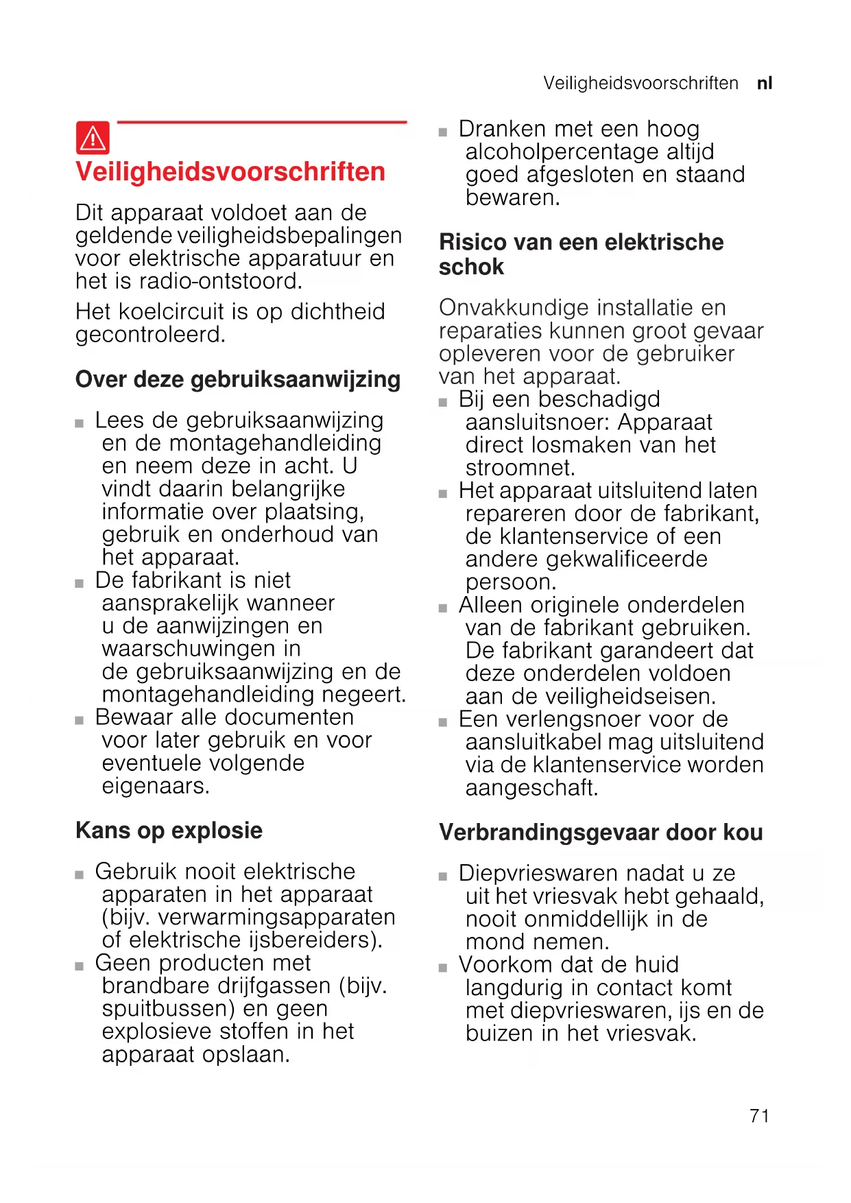 Veiligheidsvoorschriften Veiligheidsvoorschriften Dit apparaat voldoet aan de geldende veiligheidsbepalingen voor elektrische apparatuur en het is radio-ontstoord. Het koelcircuit is op dichtheid gecontroleerd. Over deze gebruiksaanwijzing ■ Lees de gebruiksaanwijzing en de montagehandleiding en neem deze in acht. U vindt daarin belangrijke informatie over plaatsing, gebruik en onderhoud van het apparaat. ■ De fabrikant is niet aansprakelijk wanneer u de aanwijzingen en waarschuwingen in de gebruiksaanwijzing en de montagehandleiding negeert. ■ Bewaar alle documenten voor later gebruik en voor eventuele volgende eigenaars. Kans op explosie ■ Gebruik nooit elektrische apparaten in het apparaat (bijv. verwarmingsapparaten of elektrische ijsbereiders). ■ Geen producten met brandbare drijfgassen (bijv. spuitbussen) en geen explosieve stoffen in het apparaat opslaan. ■ Dranken met een hoog alcoholpercentage altijd goed afgesloten en staand bewaren. Risico van een elektrische schok Onvakkundige installatie en reparaties kunnen groot gevaar opleveren voor de gebruiker van het apparaat. ■ Bij een beschadigd aansluitsnoer: Apparaat direct losmaken van het stroomnet. ■ Het apparaat uitsluitend laten repareren door de fabrikant, de klantenservice of een andere gekwalificeerde persoon. ■ Alleen originele onderdelen van de fabrikant gebruiken. De fabrikant garandeert dat deze onderdelen voldoen aan de veiligheidseisen. ■ Een verlengsnoer voor de aansluitkabel mag uitsluitend via de klantenservice worden aangeschaft. Verbrandingsgevaar door kou ■ Diepvrieswaren nadat u ze uit het vriesvak hebt gehaald, nooit onmiddellijk in de mond nemen. ■ Voorkom dat de huid langdurig in contact komt met diepvrieswaren, ijs en de buizen in het vriesvak.nl Veiligheidsvoorschriften