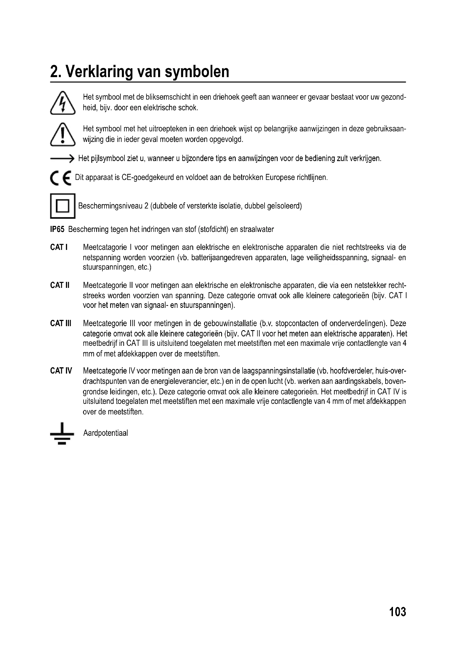 Het symbool met de bliksemschicht in een driehoek geeft aan wanneer er gevaar bestaat voor uw gezond- heid, bijv. door een elektrische schok. Het symbool met het uitroepteken in een driehoek wijst op belangrijke aanwijzingen in deze gebruiksaan- wijzing die in ieder geval moeten worden opgevolgd. Het pijlsymbool ziet u, wanneer u bijzondere tips en aanwijzingen voor de bediening zult verkrijgen. Dit apparaat is CE-goedgekeurd en voldoet aan de betrokken Europese richtlijnen. Beschermingsniveau 2 (dubbele of versterkte isolatie, dubbel geïsoleerd) IP65 Bescherming tegen het indringen van stof (stofdicht) en straalwater CAT I Meetcatagorie I voor metingen aan elektrische en elektronische apparaten die niet rechtstreeks via de netspanning worden voorzien (vb. batterijaangedreven apparaten, lage veiligheidsspanning, signaal- en stuurspanningen, etc.) CAT II Meetcategorie II voor metingen aan elektrische en elektronische apparaten, die via een netstekker recht- streeks worden voorzien van spanning. Deze categorie omvat ook alle kleinere categorieën (bijv. CAT I voor het meten van signaal- en stuurspanningen). CAT III Meetcategorie III voor metingen in de gebouwinstallatie (b.v. stopcontacten of onderverdelingen). Deze categorie omvat ook alle kleinere categorieën (bijv. CAT lI voor het meten aan elektrische apparaten). Het meetbedrijf in CAT III is uitsluitend toegelaten met meetstiften met een maximale vrije contactlengte van 4 mm of met afdekkappen over de meetstiften. CAT IV Meetcategorie IV voor metingen aan de bron van de laagspanningsinstallatie (vb. hoofdverdeler, huis-over- drachtspunten van de energieleverancier, etc.) en in de open lucht (vb. werken aan aardingskabels, boven- grondse leidingen, etc.). Deze categorie omvat ook alle kleinere categorieën. Het meetbedrijf in CAT IV is uitsluitend toegelaten met meetstiften met een maximale vrije contactlengte van 4 mm of met afdekkappen over de meetstiften. Aardpotentiaal104