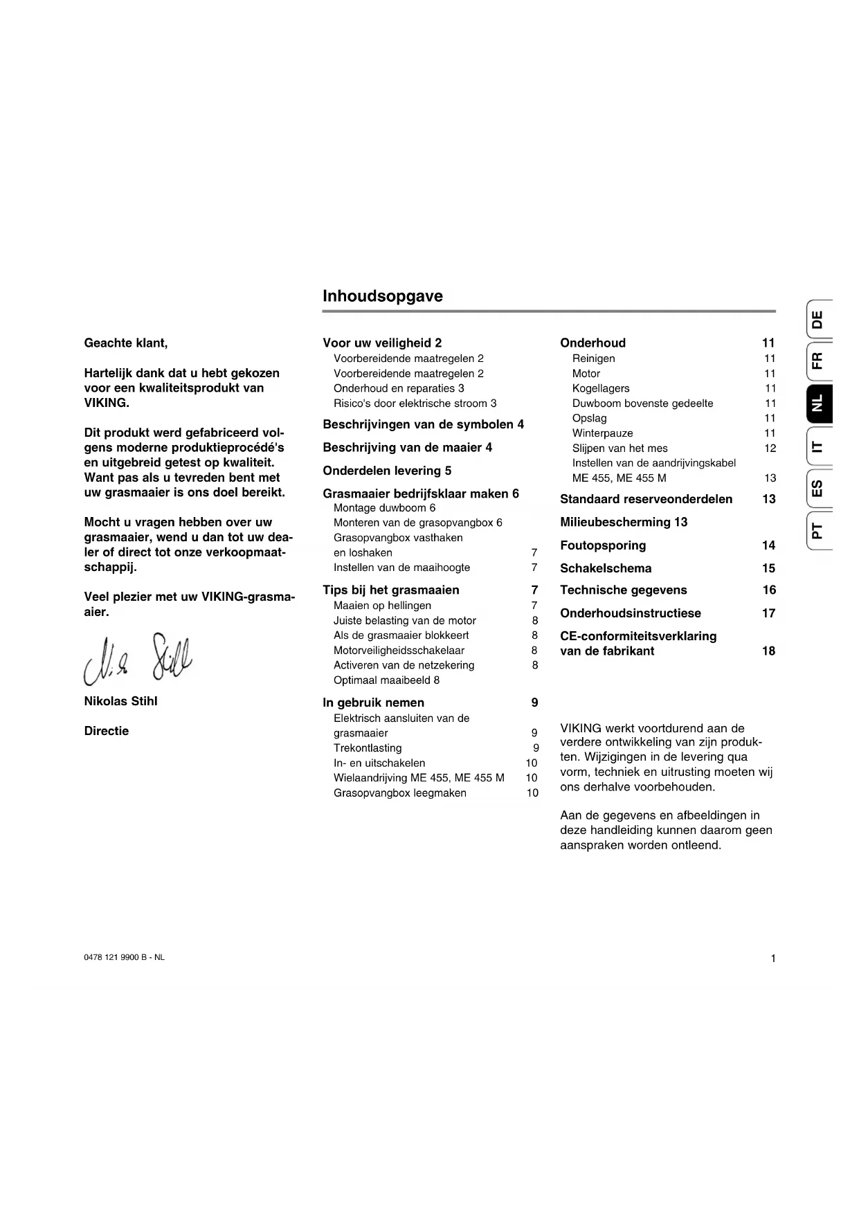 Geachte klant, Hartelijk dank dat u hebt gekozen voor een kwaliteitsprodukt van VIKING. Dit produkt werd gefabriceerd vol- gens moderne produktieprocédé's en uitgebreid getest op kwaliteit. Want pas als u tevreden bent met uw grasmaaier is ons doel bereikt. Mocht u vragen hebben over uw grasmaaier, wend u dan tot uw dea- ler of direct tot onze verkoopmaat- schappij. Veel plezier met uw VIKING-grasma- aier. Nikolas Stihl Directie VIKING werkt voortdurend aan de verdere ontwikkeling van zijn produk- ten. Wijzigingen in de levering qua vorm, techniek en uitrusting moeten wij ons derhalve voorbehouden. Aan de gegevens en afbeeldingen in deze handleiding kunnen daarom geen aanspraken worden ontleend. Inhoudsopgave Voor uw veiligheid 2 Voorbereidende maatregelen 2 Voorbereidende maatregelen 2 Onderhoud en reparaties 3 Risico's door elektrische stroom 3 Beschrijvingen van de symbolen 4 Beschrijving van de maaier 4 Onderdelen levering 5 Grasmaaier bedrijfsklaar maken 6 Montage duwboom 6 Monteren van de grasopvangbox 6 Grasopvangbox vasthaken en loshaken 7 Instellen van de maaihoogte 7 Tips bij het grasmaaien 7 Maaien op hellingen 7 Juiste belasting van de motor 8 Als de grasmaaier blokkeert 8 Motorveiligheidsschakelaar 8 Activeren van de netzekering 8 Optimaal maaibeeld 8 In gebruik nemen 9 Elektrisch aansluiten van de grasmaaier 9 Trekontlasting 9 In- en uitschakelen 10 Wielaandrijving ME 455, ME 455 M 10 Grasopvangbox leegmaken 10 Onderhoud 11 Reinigen 11 Motor 11 Kogellagers 11 Duwboom bovenste gedeelte 11 Opslag 11 Winterpauze 11 Slijpen van het mes 12 Instellen van de aandrijvingskabel ME 455, ME 455 M 13 Standaard reserveonderdelen 13 Milieubescherming 13 Foutopsporing 14 Schakelschema 15 Technische gegevens 16 Onderhoudsinstructiese 17 CE-conformiteitsverklaring van de fabrikant 182 0478 121 9900 B - NL Bij het werken met de grasmaaier dienen deze voorschriften ter voorkoming van ongevallen absoluut in acht te worden genomen. Lees de gehele gebruik- saanwijzing zorgvuldig door alvorens het apparaat in gebruik te nemen. Bewaar de gebruiksaanwij- zing goed. Maak u vertrouwd met de bedieningsele- menten en het gebruik van de machine. Sta nooit toe dat kinderen of andere personen, die de bedieningshandleiding niet kennen, de maaier gebruiken. Jongeren onder de 16 jaar mogen de grasmaaier niet gebruiken. Maai nooit terwijl er personen, met name kinderen, of dieren in de buurt zijn. Denk eraan dat degene die de machine bedient of de gebruiker verantwoordelijk is voor ongevallen met andere personen of hun eigendommen. Na het gebruik van alcohol, drugs of medi- cijnen die de reactiesnelheid nadelig beïnv- loeden mag niet met het apparaat worden gewerkt. Voor de eerste ingebruikname moeten instructies door de verkoper of een andere vakkundige worden gegeven. De grasmaaier is alleen voor het maaien van gras bestemd. Een andere toepassing is niet toegestaan. Wegens gevaar voor lichamelijk letsel van de gebruiker mag de grasmaaier niet worden gebruikt voor het schoonmaken (afzuigen, schoonblazen, sneeuwruimen) van voetpaden of als versnipperaar voor het kleinmaken van snoeiafval van bomen en struiken. Voorbereidende maatregelen