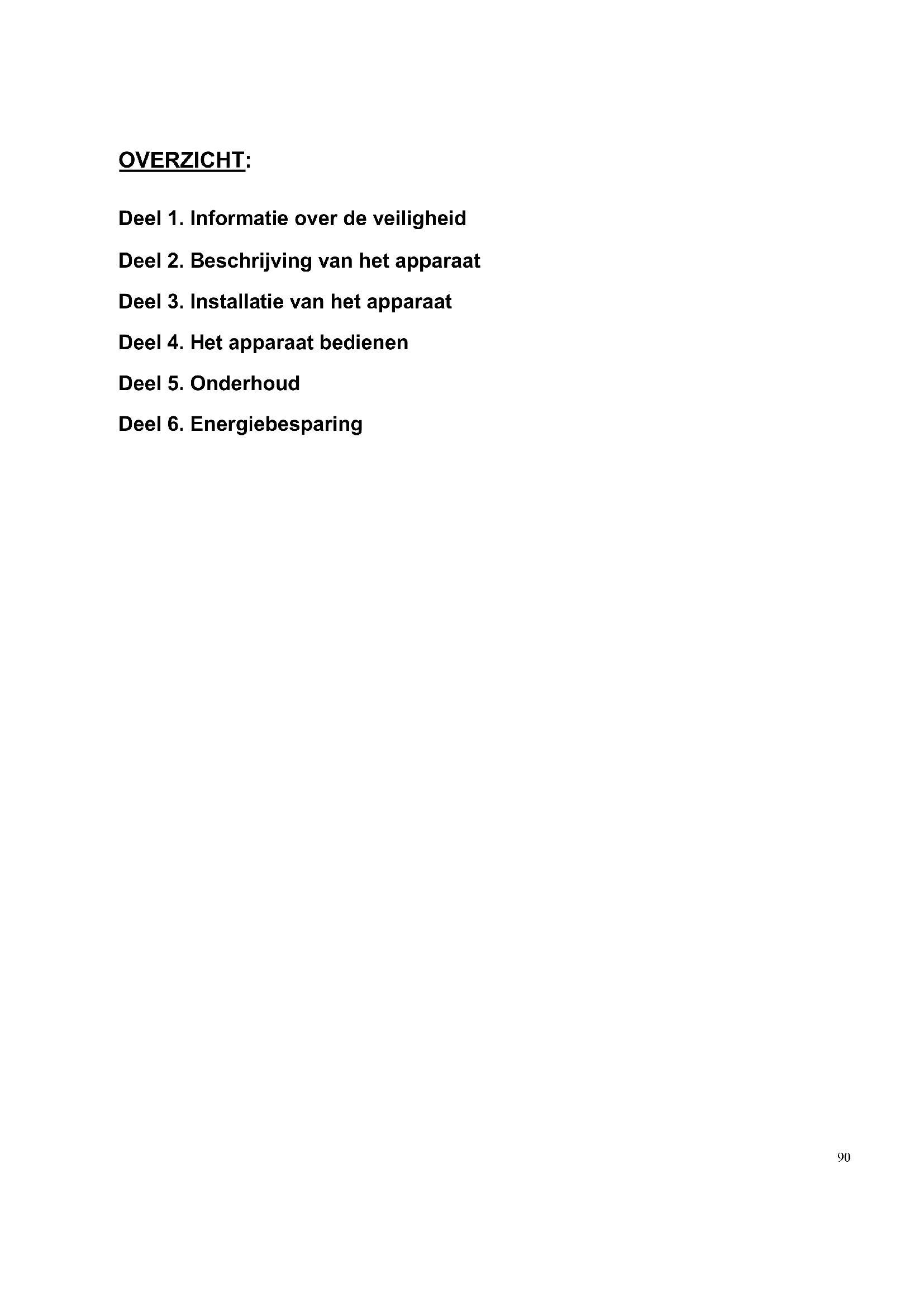Este aparelho está marcado de acordo com a Directiva europeia 2012/19/CE sobre Resíduos de Equipamento Eléctrico e Electrónico (DEEE). Os DEEE contêm substâncias poluentes (que podem causar consequências negativas para o ambiente) e componentes básicos (que podem ser reutilizados). É importante que os DEEE sejam submetidos a tratamentos específicos, de maneira a remover e eliminar adequadamente todos os poluentes, e recuperar e reciclar todos os materiais. Os indivíduos têm um papel importante ao assegurar que os DEEE não se tornam num problema ambiental, é essencial seguir algumas regras básicas: Os DEEE não devem ser tratados como resíduos domésticos. Os DEEE devem ser entregues nos pontos de recolha relevantes geridos pelo município ou por companhias registadas. Em muitos países, a recolha casa-a-casa, para DEEE de grandes dimensões, pode existir. Em muitos países, ao comprar um novo aparelho, o antigo pode ser devolvido ao comerciante que tem de o recolher sem qualquer custo, um-para-um, desde que o equipamento seja de tipo equivalente e tenha as mesmas funções que o equipamento fornecido. Conformidade Ao colocar a marca neste produto, estamos a confirmar a conformidade com todos os requisitos de segurança, saúde e ambiente relevantes que são aplicáveis na legislação sobre este produto.90 OVERZICHT: Deel 1. Informatie over de veiligheid Deel 2. Beschrijving van het apparaat Deel 3. Installatie van het apparaat Deel 4. Het apparaat bedienen Deel 5. Onderhoud Deel 6. Energiebesparing91 Bedankt voor de aankoop van dit product. Lees deze instructiehandleiding zorgvuldig door voordat u uw koelkast gaat gebruiken, voor de beste prestaties van het apparaat. Bewaar alle documentatie voor toekomstig gebruik of voor andere eigenaren. Dit product is uitsluitend bedoeld voor huishoudelijk gebruik of voor soortgelijke toepassingen, zoals: - de keukenruimte voor personeel in winkels, kantoren en andere werkomgevingen - op boerderijen, door gasten van hotels, motels en andere woonomgevingen - in bed and breakfasts (B & B) - voor cateringservices en dergelijke toepassingen die niet voor de kleinhandel zijn. Dit apparaat mag uitsluitend worden gebruikt voor het bewaren van voedsel. Elk ander gebruik moet als gevaarlijk worden beschouwd en de fabrikant is niet verantwoordelijk voor nalatigheid. Het is ook aan te raden om de garantievoorwaarden door te lezen. Voor de beste prestaties en probleemloze werking van uw apparaat, is het zeer belangrijk om deze instructies zorgvuldig te lezen. Als u deze instructies niet in acht neemt, kan uw recht op gratis onderhoud tijdens de garantieperiode vervallen.92 Deel 1. Informatie over de veiligheid In deze handleiding staat veel belangrijke veiligheidsinformatie. We raden u aan om deze instructies op een veilige plaats te bewaren om ze gemakkelijk te kunnen raadplegen en optimaal van uw apparaat gebruik te kunnen maken. De koelkast bevat een koelgas (R600a: isobutaan) en een isolerend gas (cyclopentaan), die milieuvriendelijk, maar wel brandbaar zijn. Voorzichtig: brandgevaar Als het koelcircuit beschadigd raakt: Vermijd open vuur en ontstekingsbronnen. Ventileer de ruimte waarin het apparaat staat zeer goed. Percentage bedrijfstijd: WAARSCHUWING!