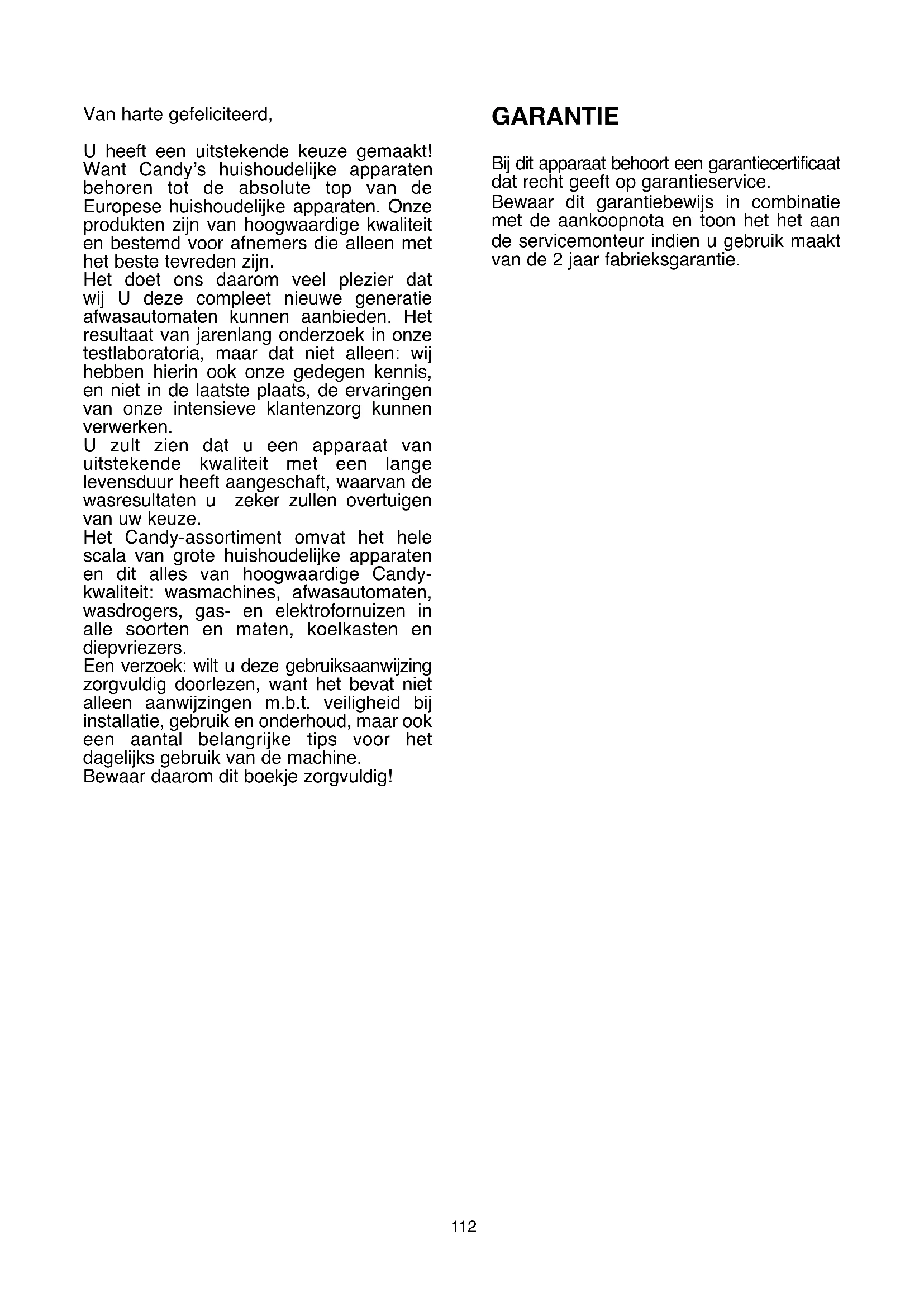 Van harte gefeliciteerd, U heeft een uitstekende keuze gemaakt! Want Candy’s huishoudelijke apparaten behoren tot de absolute top van de Europese huishoudelijke apparaten. Onze produkten zijn van hoogwaardige kwaliteit en bestemd voor afnemers die alleen met het beste tevreden zijn. Het doet ons daarom veel plezier dat wij U deze compleet nieuwe generatie afwasautomaten kunnen aanbieden. Het resultaat van jarenlang onderzoek in onze testlaboratoria, maar dat niet alleen: wij hebben hierin ook onze gedegen kennis, en niet in de laatste plaats, de ervaringen van onze intensieve klantenzorg kunnen verwerken. U zult zien dat u een apparaat van uitstekende kwaliteit met een lange levensduur heeft aangeschaft, waarvan de wasresultaten u zeker zullen overtuigen van uw keuze. Het Candy-assortiment omvat het hele scala van grote huishoudelijke apparaten en dit alles van hoogwaardige Candy- kwaliteit: wasmachines, afwasautomaten, wasdrogers, gas- en elektrofornuizen in alle soorten en maten, koelkasten en diepvriezers. Een verzoek: wilt u deze gebruiksaanwijzing zorgvuldig doorlezen, want het bevat niet alleen aanwijzingen m.b.t. veiligheid bij installatie, gebruik en onderhoud, maar ook een aantal belangrijke tips voor het dagelijks gebruik van de machine. Bewaar daarom dit boekje zorgvuldig! GARANTIE Bij dit apparaat behoort een garantiecertificaat dat recht geeft op garantieservice. Bewaar dit garantiebewijs in combinatie met de aankoopnota en toon het het aan de servicemonteur indien u gebruik maakt van de 2 jaar fabrieksgarantie.113 BEDIENINGSPANEEL
