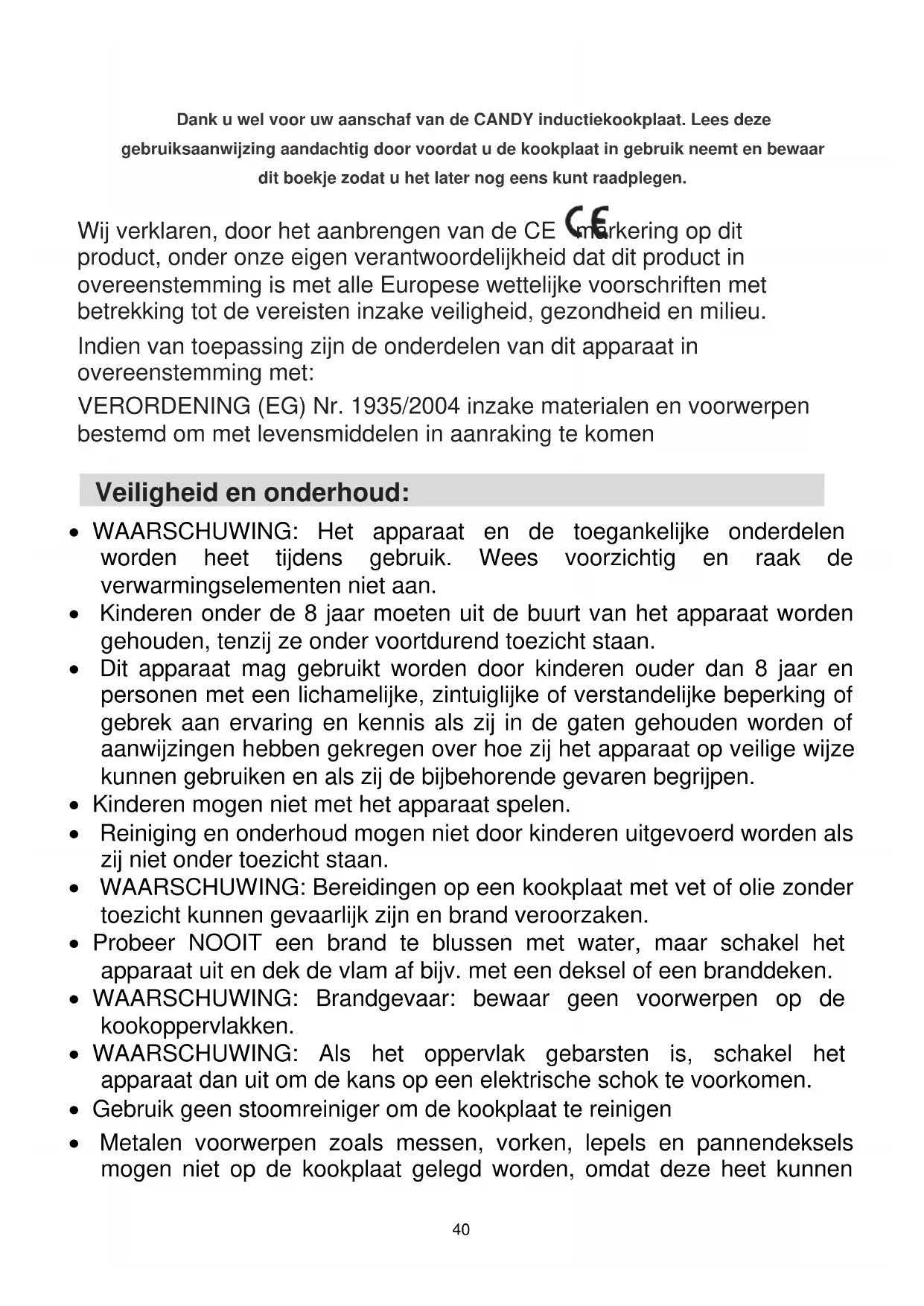 Déclaration spéciale Le contenu de ce manuel a été soigneusement vérifié. Toutefois, la société ne peut être tenue responsable de toute erreur d'impression ou omission. De plus, toute modification technique peut être incluse dans une version révisée du manuel sans préavis. L'apparence et la couleur de l'appareil dans ce manuel peuvent différer de la couleur réelle.40 Dank u wel voor uw aanschaf van de CANDY inductiekookplaat. Lees deze gebruiksaanwijzing aandachtig door voordat u de kookplaat in gebruik neemt en bewaar dit boekje zodat u het later nog eens kunt raadplegen. Wij verklaren, door het aanbrengen van de CE markering op dit product, onder onze eigen verantwoordelijkheid dat dit product in overeenstemming is met alle Europese wettelijke voorschriften met betrekking tot de vereisten inzake veiligheid, gezondheid en milieu. Indien van toepassing zijn de onderdelen van dit apparaat in overeenstemming met: VERORDENING (EG) Nr. 1935/2004 inzake materialen en voorwerpen bestemd om met levensmiddelen in aanraking te komen Veiligheid en onderhoud: